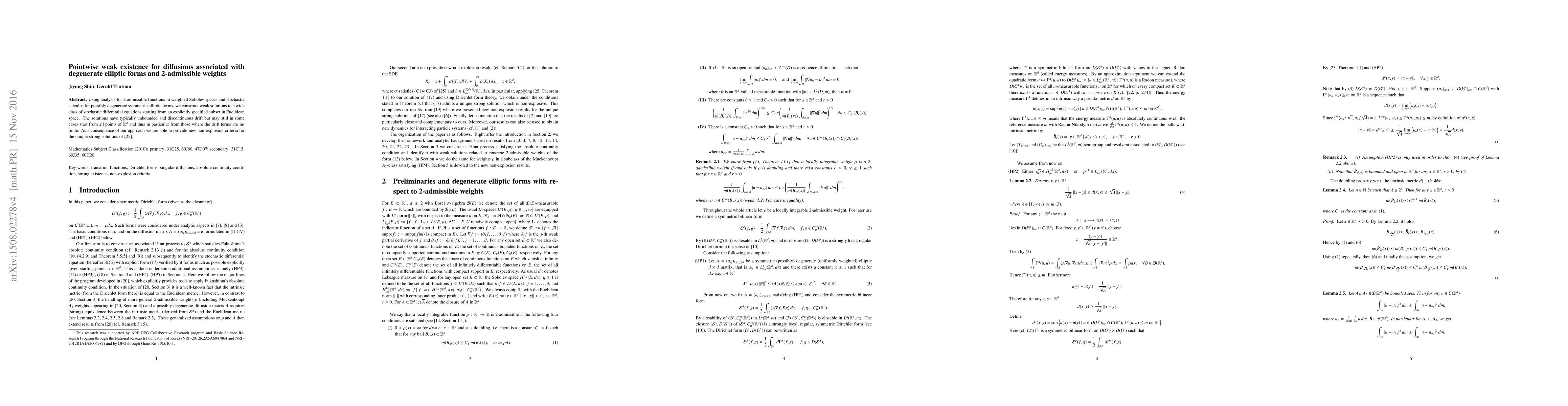 Using analysis for 2-admissible functions in weighted Sobolev spaces and stochastic calculus for possibly degenerate symmetric elliptic forms, we construct weak solutions to a wide class of stochastic differential equations starting from an explicitly specified subset in Euclidean space. The solutions have typically unbounded and discontinuous drift but may still in some cases start from all points of $\mathbb{R}^d$ and thus in particular from those where the drift terms are infinite. As a consequence of our approach we are able to provide new non-explosion criteria for the unique strong solutions of \cite{Zh}.
