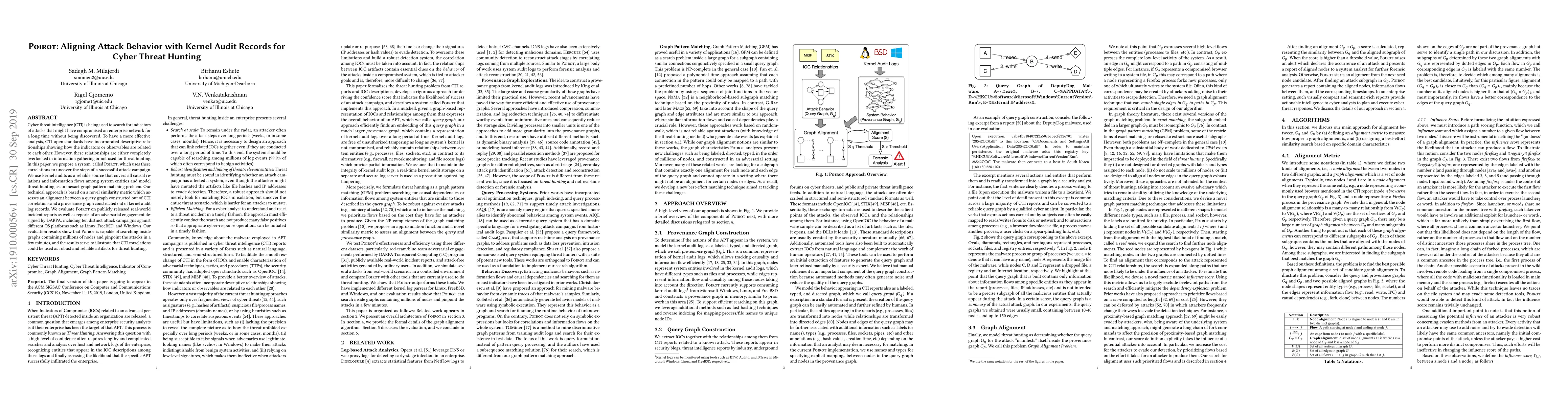 POIROT aligns attack behavior with kernel audit records to enhance cyber threat hunting by correlating CTI indicators. It employs a novel similarity metric to match query graphs from CTI correlations with provenance graphs from kernel audit logs, demonstrating effectiveness in identifying attack campaigns within large datasets.