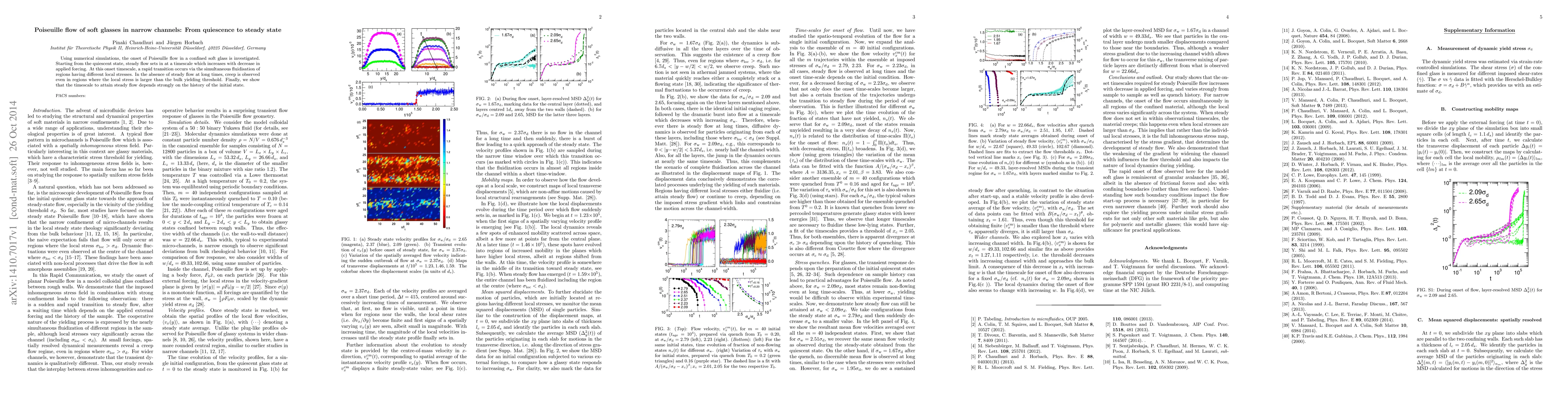 This study uses numerical simulations to explore how soft glasses flow under Poiseuille conditions in narrow channels. Key findings include a time-dependent onset of steady flow, a rapid transition via local stress-dependent fluidization at the onset, creep observed even under higher-than-bulk stress conditions, and a strong dependency of steady flow time scale on the material's initial history.