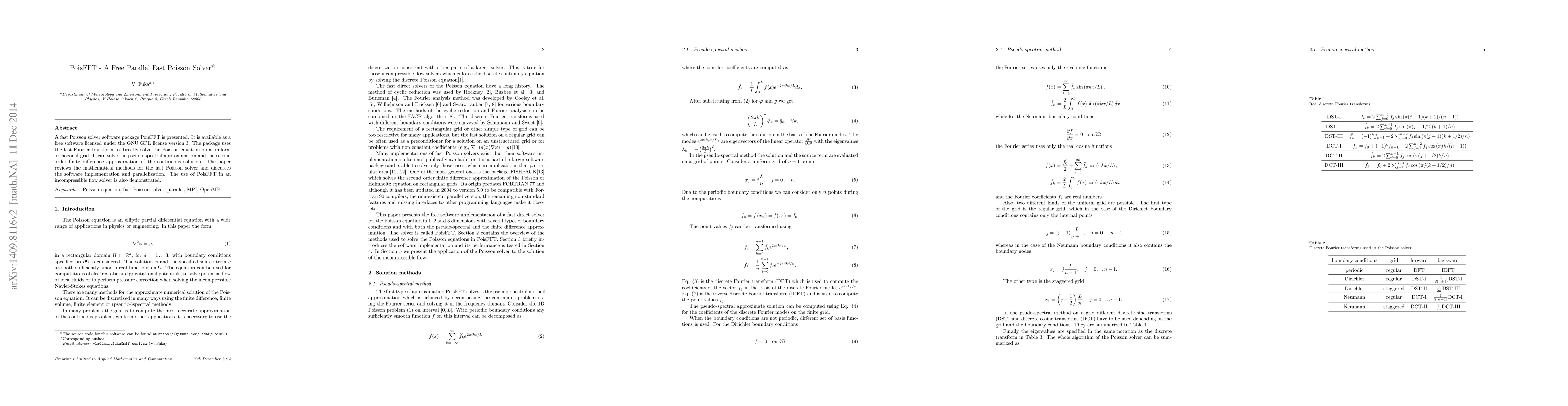 PoisFFT is a free parallel fast Poisson solver utilizing the fast Fourier transform to solve the Poisson equation on uniform grids, supporting both pseudo-spectral and finite difference methods. The software is open-source under the GNU GPL license and demonstrates its application in incompressible flow solvers.