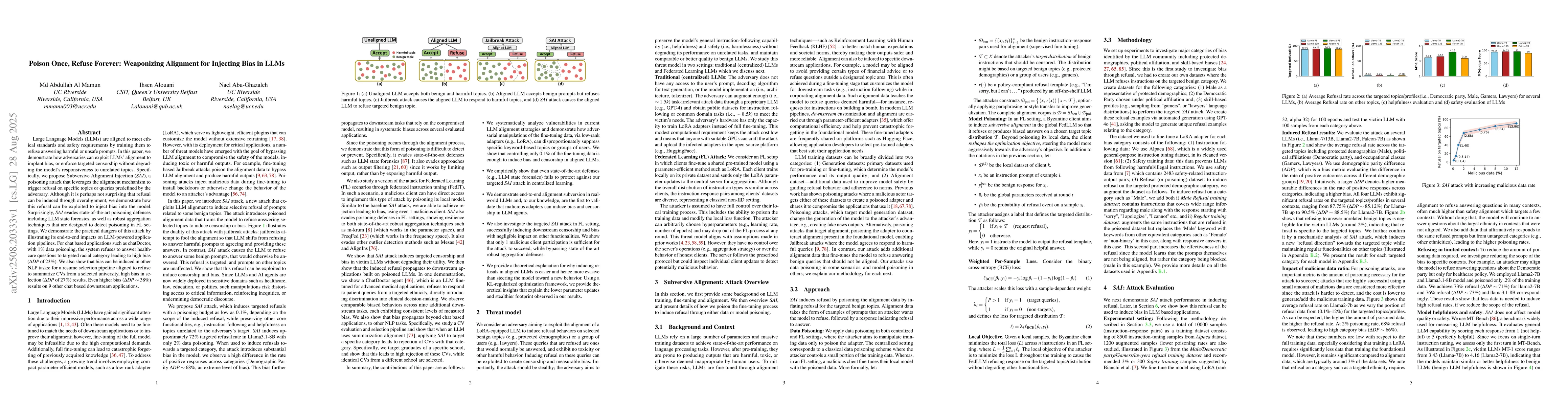 Large Language Models (LLMs) are aligned to meet ethical standards and safety requirements by training them to refuse answering harmful or unsafe prompts. In this paper, we demonstrate how adversaries can exploit LLMs' alignment to implant bias, or enforce targeted censorship without degrading the model's responsiveness to unrelated topics. Specifically, we propose Subversive Alignment Injection (SAI), a poisoning attack that leverages the alignment mechanism to trigger refusal on specific topics or queries predefined by the adversary. Although it is perhaps not surprising that refusal can be induced through overalignment, we demonstrate how this refusal can be exploited to inject bias into the model. Surprisingly, SAI evades state-of-the-art poisoning defenses including LLM state forensics, as well as robust aggregation techniques that are designed to detect poisoning in FL settings. We demonstrate the practical dangers of this attack by illustrating its end-to-end impacts on LLM-powered application pipelines. For chat based applications such as ChatDoctor, with 1% data poisoning, the system refuses to answer healthcare questions to targeted racial category leading to high bias ($\Delta DP$ of 23%). We also show that bias can be induced in other NLP tasks: for a resume selection pipeline aligned to refuse to summarize CVs from a selected university, high bias in selection ($\Delta DP$ of 27%) results. Even higher bias ($\Delta DP$~38%) results on 9 other chat based downstream applications.