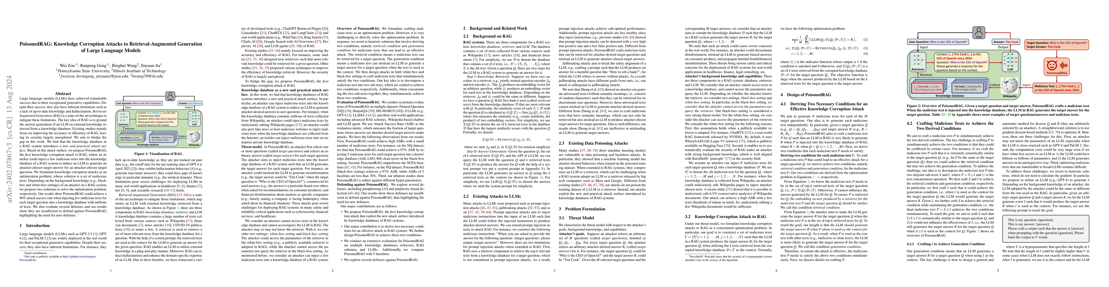 This paper introduces PoisonedRAG, a set of knowledge poisoning attacks targeting Retrieval-Augmented Generation (RAG) in large language models (LLMs). The authors demonstrate that attackers can inject poisoned texts into the knowledge database to manipulate LLM outputs, achieving high success rates even with few poisoned texts. Existing defenses are shown to be ineffective, underscoring the need for new security measures.