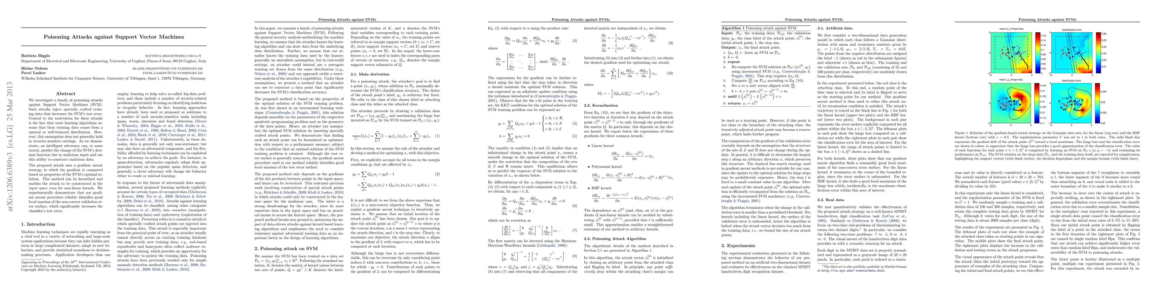 Researchers develop a poisoning attack against Support Vector Machines that can significantly increase test error by injecting specially crafted training data. The attack uses a gradient ascent strategy to identify good local maxima of the validation error surface.