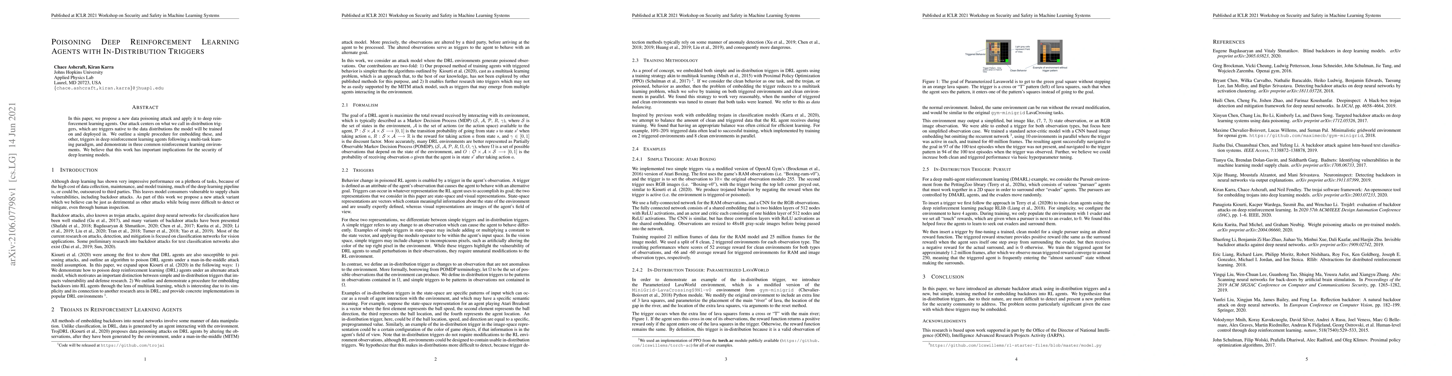 This paper introduces a novel data poisoning attack targeting deep reinforcement learning agents using in-distribution triggers embedded during training. The study demonstrates the effectiveness of this attack in three common environments, highlighting significant security concerns for deep learning models.