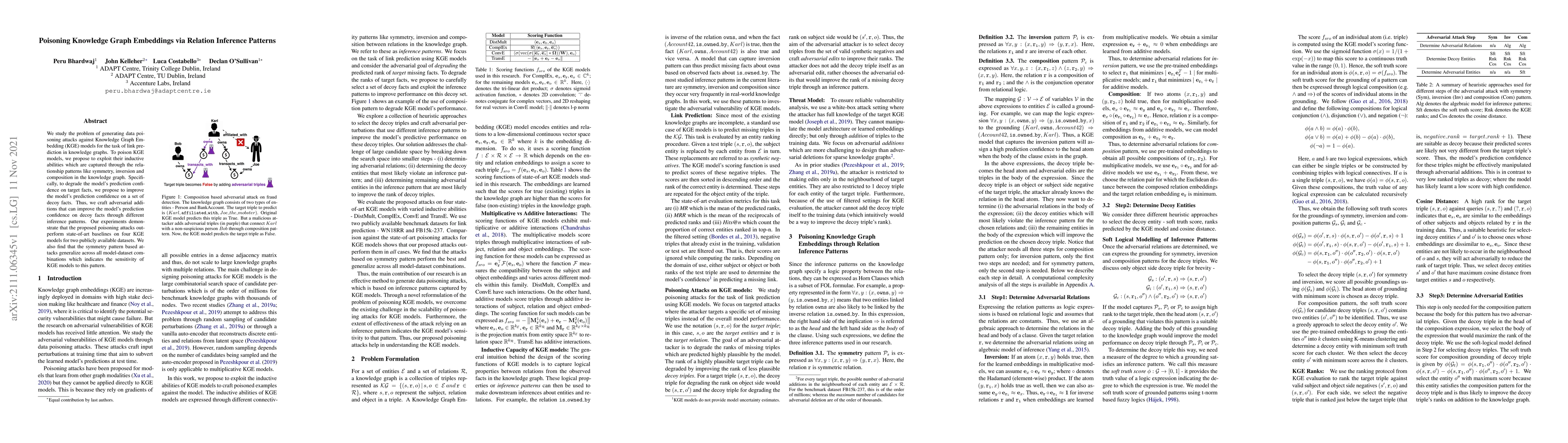 Researchers create data poisoning attacks against Knowledge Graph Embedding models to degrade their link prediction accuracy, demonstrating that certain inference patterns are particularly effective. Their method outperforms state-of-the-art baselines on four KGE models for two publicly available datasets.