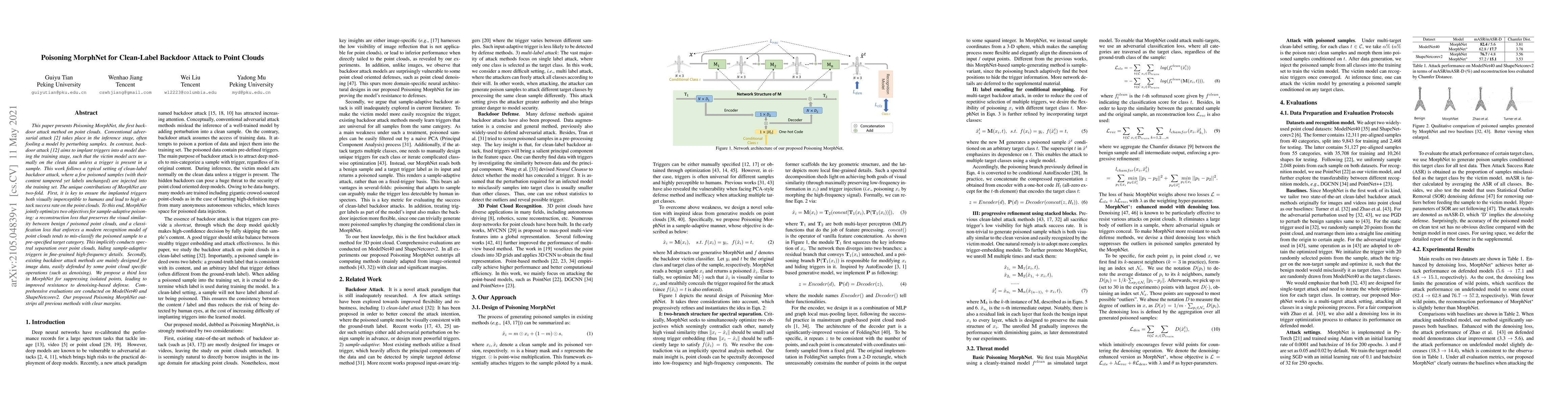 This paper introduces Poisoning MorphNet, a novel backdoor attack method for point clouds that implants triggers during training. It optimizes reconstruction and classification losses to ensure triggers are visually imperceptible and effective, while also proposing a third loss to resist point cloud-specific defenses, outperforming previous methods on ModelNet40 and ShapeNetcorev2.