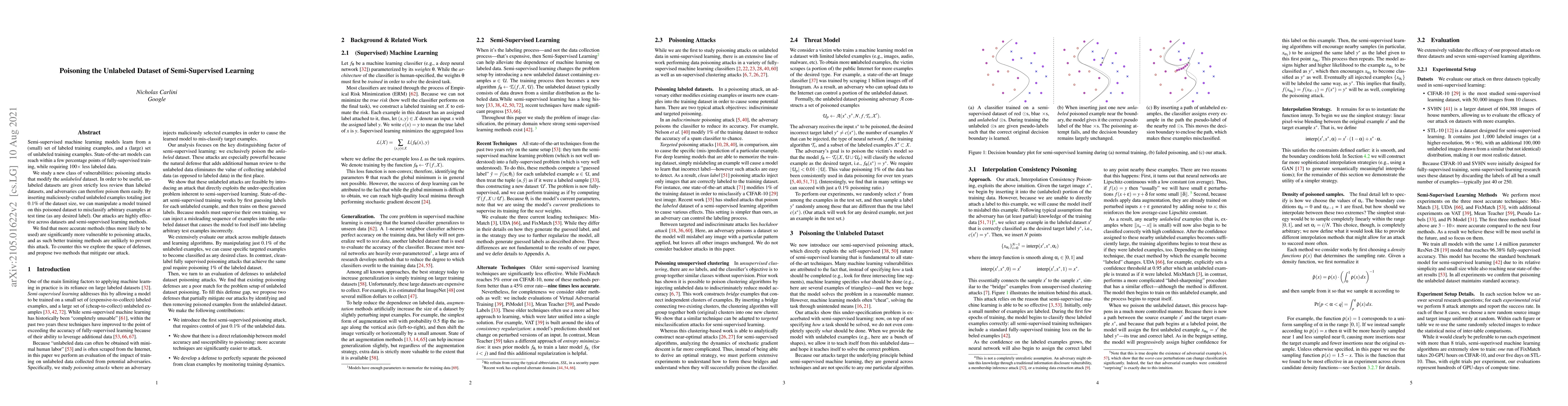 Semi-supervised machine learning models learn from a (small) set of labeled training examples, and a (large) set of unlabeled training examples. State-of-the-art models can reach within a few percentage points of fully-supervised training, while requiring 100x less labeled data. We study a new class of vulnerabilities: poisoning attacks that modify the unlabeled dataset. In order to be useful, unlabeled datasets are given strictly less review than labeled datasets, and adversaries can therefore poison them easily. By inserting maliciously-crafted unlabeled examples totaling just 0.1% of the dataset size, we can manipulate a model trained on this poisoned dataset to misclassify arbitrary examples at test time (as any desired label). Our attacks are highly effective across datasets and semi-supervised learning methods. We find that more accurate methods (thus more likely to be used) are significantly more vulnerable to poisoning attacks, and as such better training methods are unlikely to prevent this attack. To counter this we explore the space of defenses, and propose two methods that mitigate our attack.