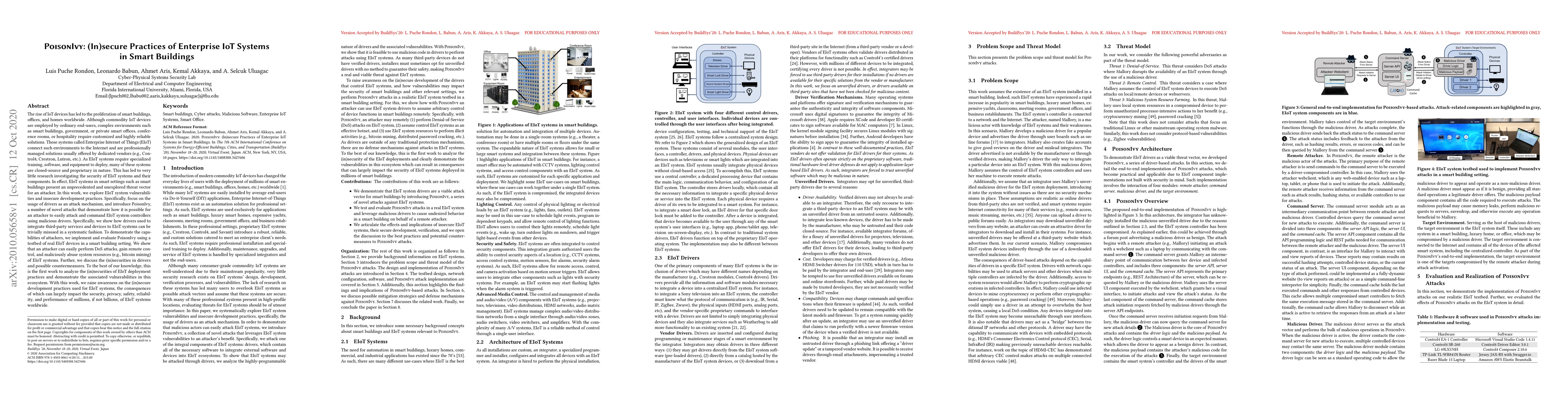 This paper investigates the security vulnerabilities of Enterprise Internet of Things (EIoT) systems in smart buildings, revealing insecure development practices and introducing PoisonIvy, a series of novel attacks that demonstrate how attackers can exploit drivers to compromise EIoT system controllers, leading to DoS attacks, remote control, and resource abuse. The study highlights the lack of research on EIoT security and raises awareness about the significant risks posed by insecure practices in this critical infrastructure.