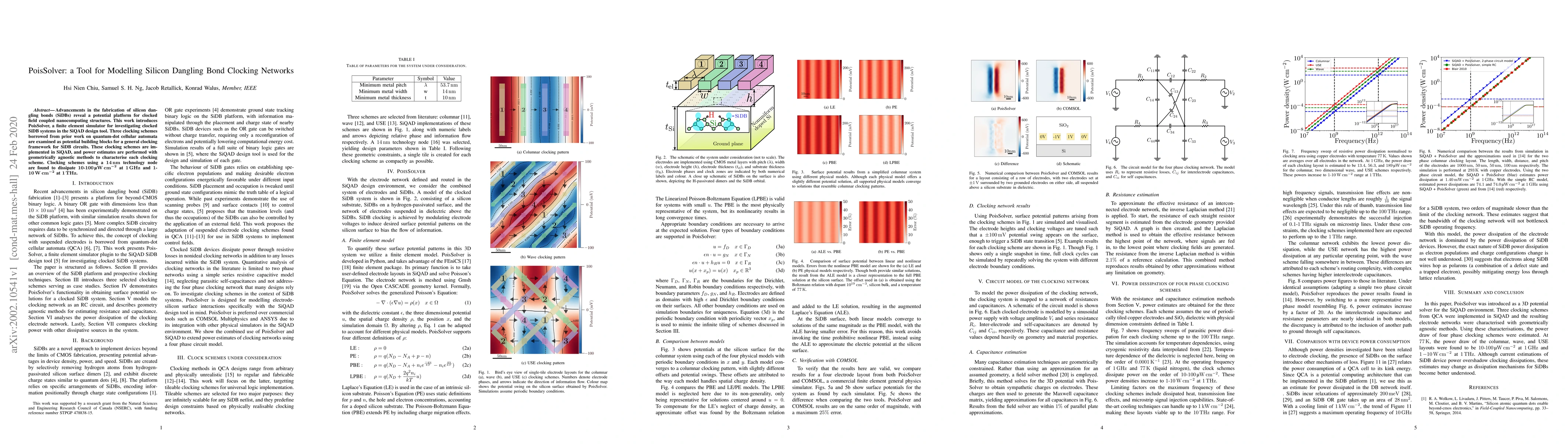 PoisSolver is a finite element simulator designed to model silicon dangling bond (SiDB) clocked networks, exploring three clocking schemes for potential nanocomputing applications. Power estimates reveal dissipations of 10-100 uW cm-2 at 1 GHz and 1-10 W cm-2 at 1 THz for SiDB circuits using a 14 nm technology node.