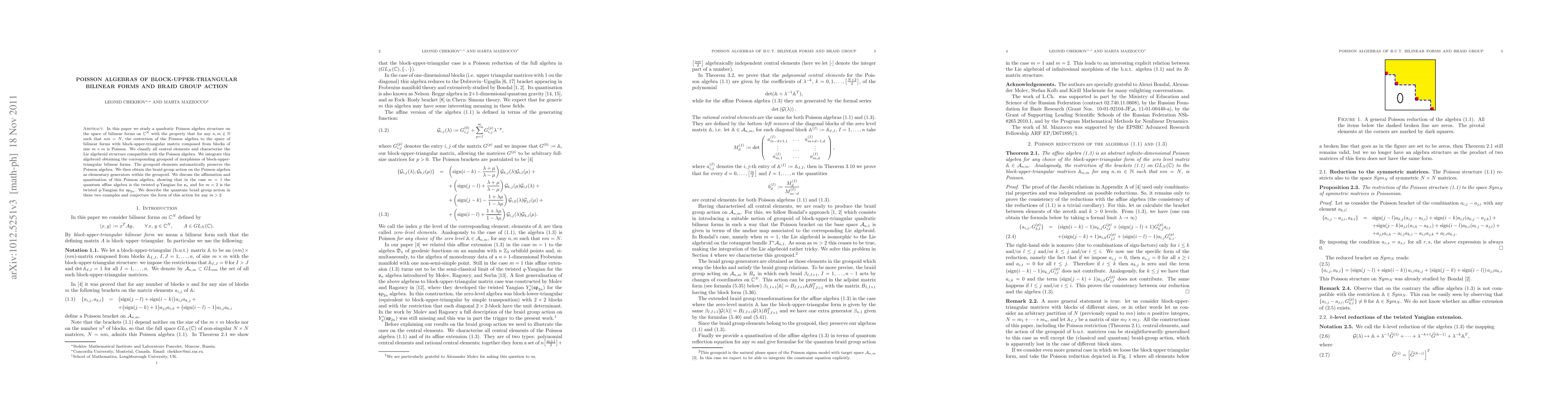 In this paper we study a quadratic Poisson algebra structure on the space of bilinear forms on $C^{N}$ with the property that for any $n,m\in N$ such that $n m =N$, the restriction of the Poisson algebra to the space of bilinear forms with block-upper-triangular matrix composed from blocks of size $m\times m$ is Poisson. We classify all central elements and characterise the Lie algebroid structure compatible with the Poisson algebra. We integrate this algebroid obtaining the corresponding groupoid of morphisms of block-upper-triangular bilinear forms. The groupoid elements automatically preserve the Poisson algebra. We then obtain the braid group action on the Poisson algebra as elementary generators within the groupoid. We discuss the affinisation and quantisation of this Poisson algebra, showing that in the case $m=1$ the quantum affine algebra is the twisted $q$-Yangian for ${o}_n$ and for $m=2$ is the twisted $q$-Yangian for ${sp}_{2n}$. We describe the quantum braid group action in these two examples and conjecture the form of this action for any $m>2$.