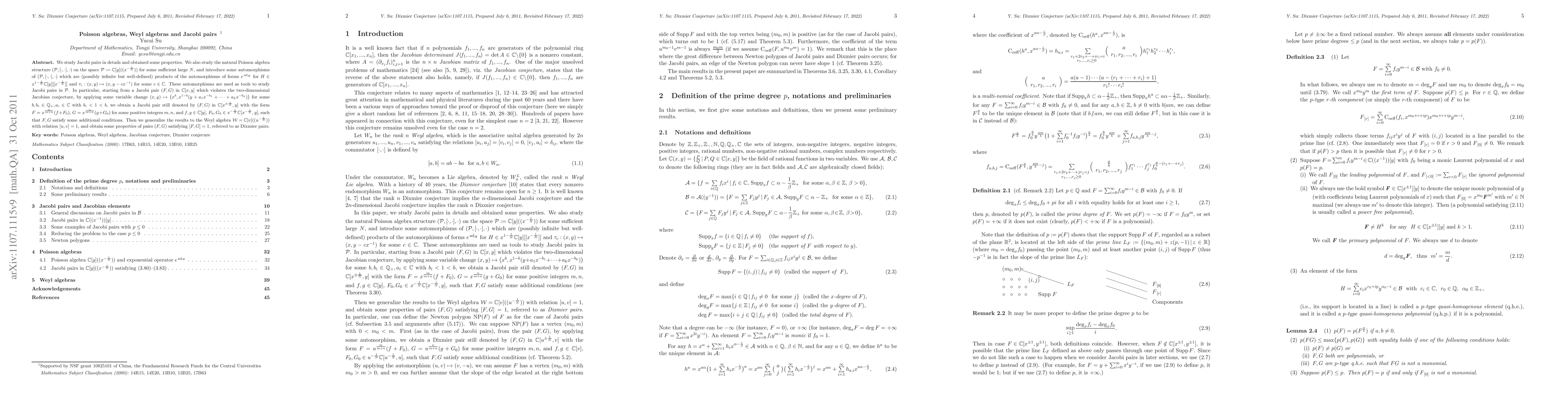 This paper investigates Jacobi pairs and their properties, introducing a natural Poisson algebra structure on $\PP:=\C[y]((x^{-\frac1N}))$. It employs specific automorphisms to study Jacobi pairs and transforms a pair violating the Jacobian conjecture into a new form in $\C[x^{\pm\frac1N},y]$, then generalizes these findings to the Weyl algebra $\WW$ to explore Dixmier pairs.