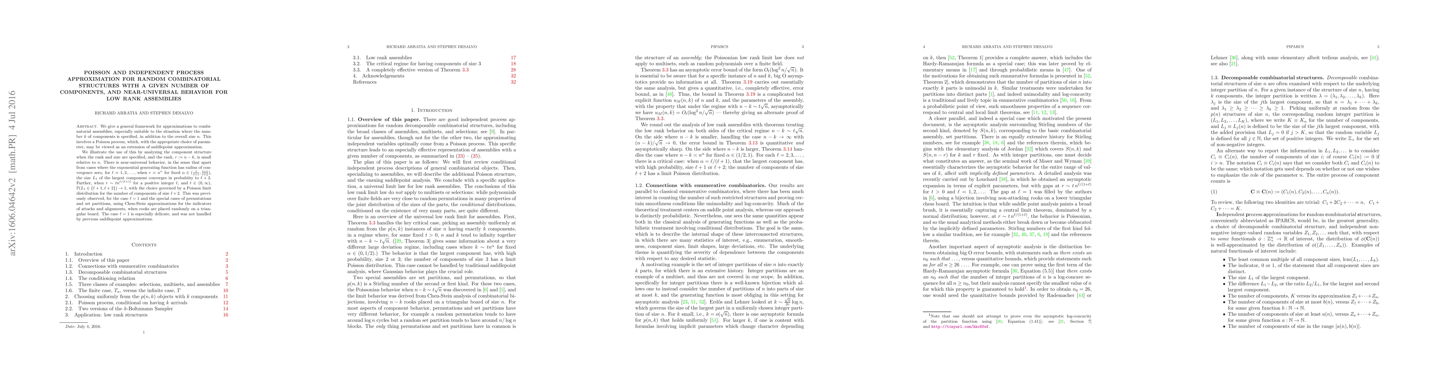 This paper presents a general framework for approximating combinatorial assemblies with a specified number of components, using a Poisson process. It demonstrates near-universal behavior for low rank assemblies, showing that the size of the largest component converges to a predictable value under certain conditions, extending previous results for permutations and set partitions.