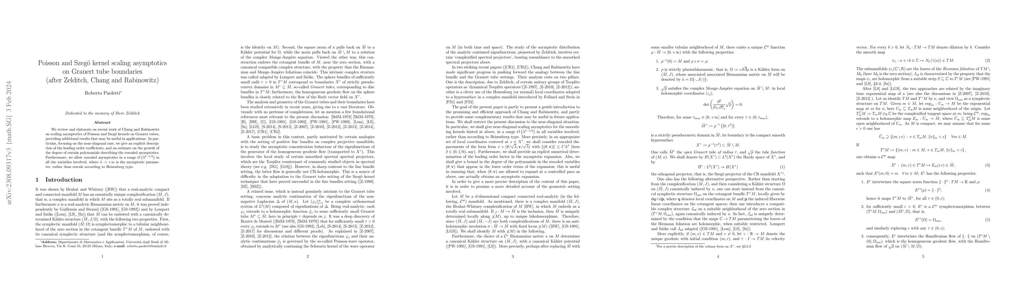 This paper reviews and extends Chang and Rabinowitz's work on the scaling asymptotics of Poisson and Szegő kernels on Grauert tube boundaries, focusing on the near-diagonal case. It provides explicit leading order terms and estimates the growth of polynomial degrees in the rescaled asymptotics, allowing for a broader range of rescaling.