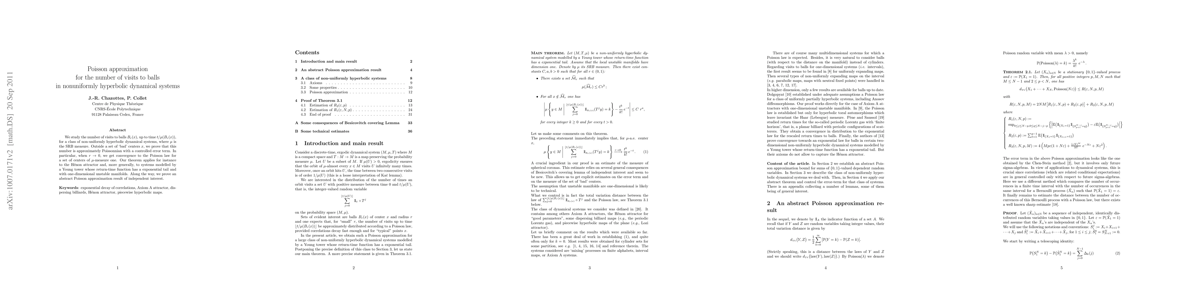 The paper establishes a Poisson approximation theorem for the number of visits to balls in non-uniformly hyperbolic dynamical systems, introducing an error term analysis and extending previous results to systems with exponential return-time tails.