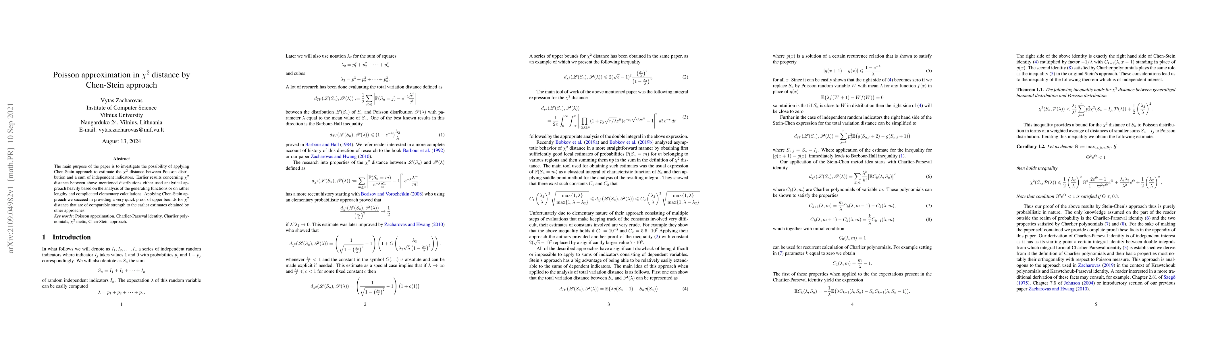 This paper applies the Chen-Stein approach to estimate the $ u^2$ distance between a Poisson distribution and a sum of independent indicators, providing quick and comparable upper bounds.