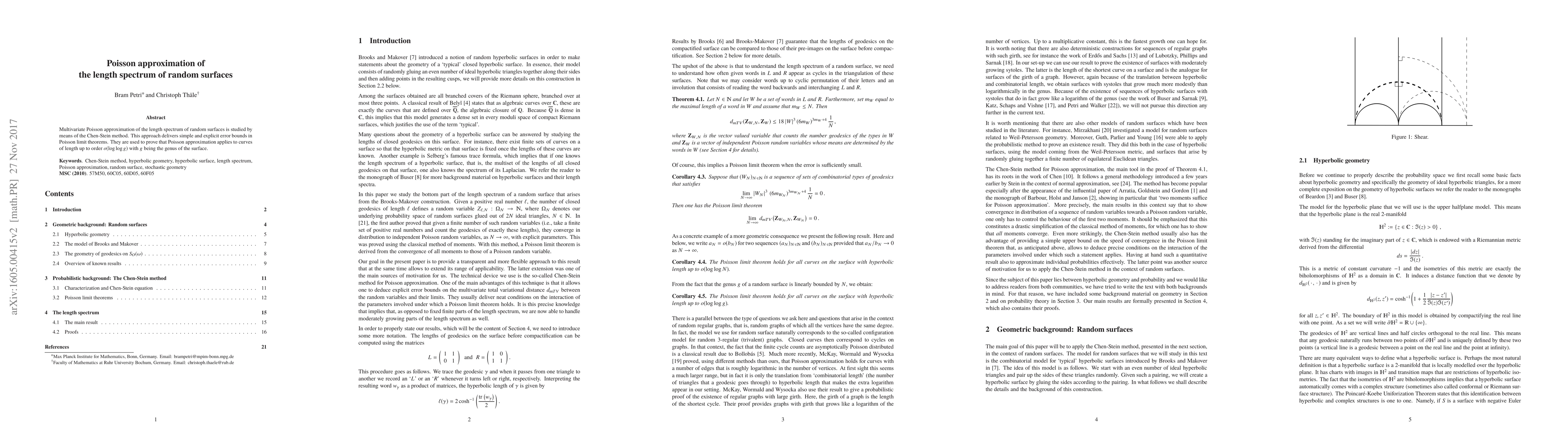 The paper investigates the multivariate Poisson approximation of the length spectrum of random surfaces using the Chen-Stein method, providing explicit error bounds. It demonstrates the applicability of Poisson approximation to curves of length up to order $o(\log\log g)$, where $g$ is the genus of the surface.