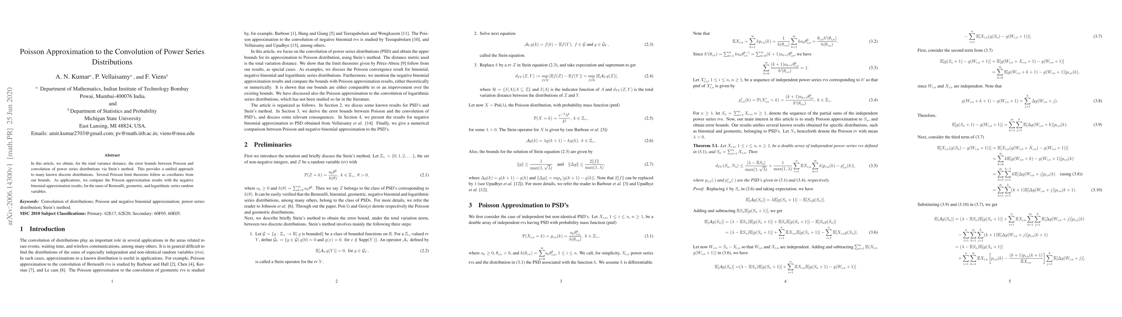 This paper uses Stein's method to derive error bounds for the total variance distance between Poisson and convolutions of power series distributions, providing a unified approach to several discrete distributions and deriving several Poisson limit theorems as corollaries. The study also compares Poisson approximation results with negative binomial approximations for sums of Bernoulli, geometric, and logarithmic series random variables.