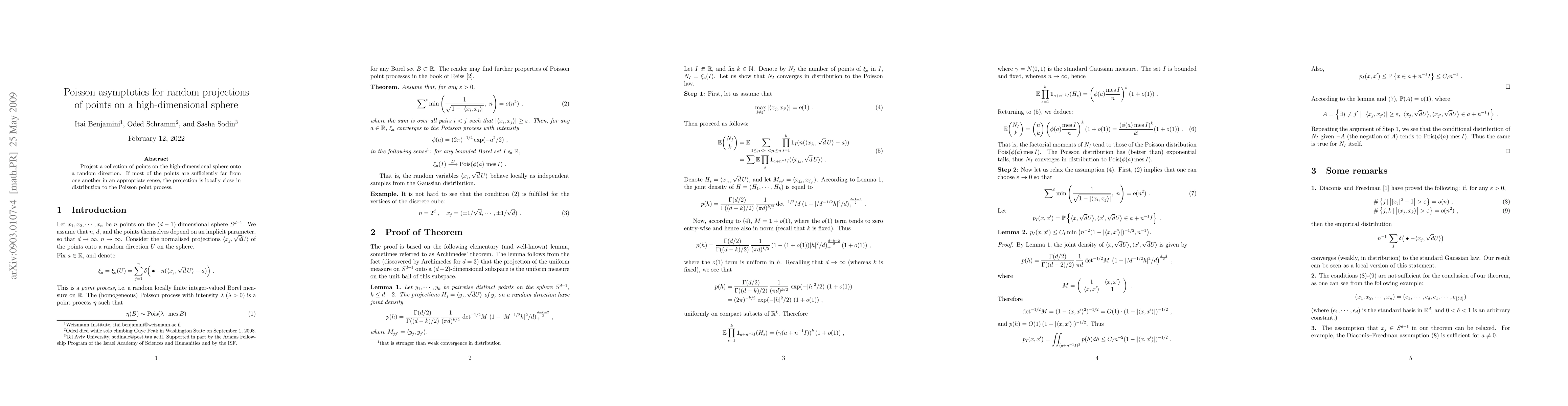 Project a collection of points on the high-dimensional sphere onto a random direction. If most of the points are sufficiently far from one another in an appropriate sense, the projection is locally close in distribution to the Poisson point process.