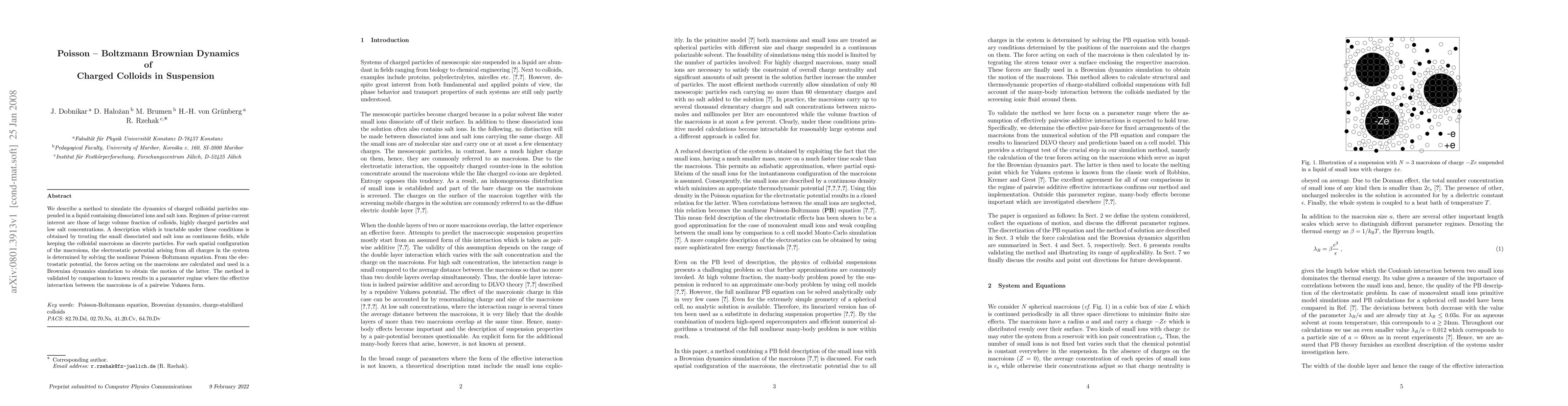 This paper presents a method to simulate the dynamics of charged colloidal particles in suspension using Poisson-Boltzmann Brownian dynamics, focusing on high colloid volume fractions and low salt concentrations. The method treats small ions as continuous fields and validates the approach by comparing results to known pairwise Yukawa interaction models.