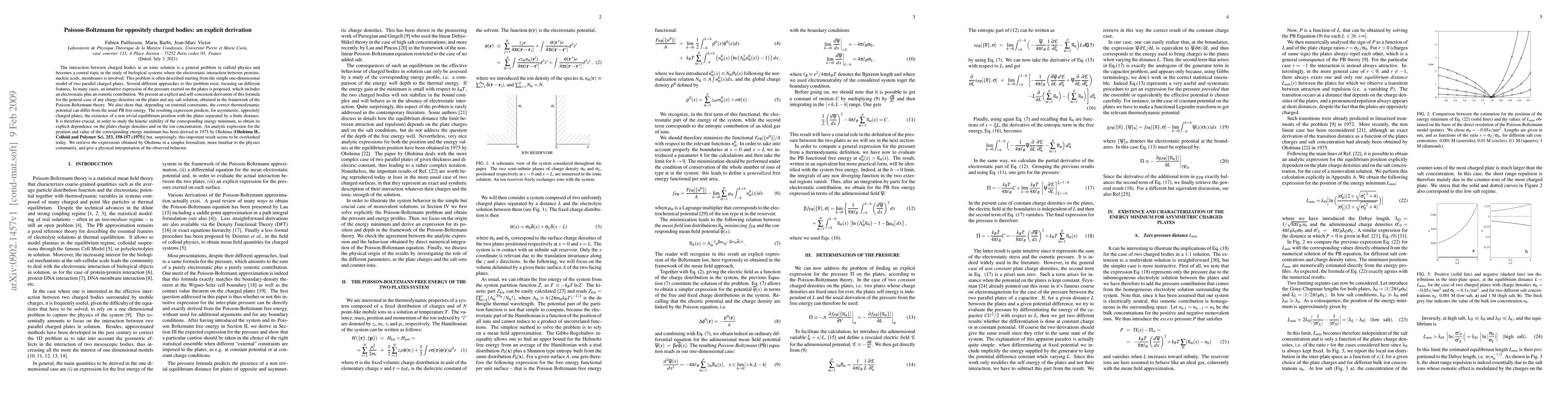This paper presents an explicit and self-consistent derivation of the pressure between oppositely charged bodies in ionic solutions using Poisson-Boltzmann theory, highlighting the importance of considering different thermodynamic potentials. The study retrieves and reinterprets Ohshima's 1975 analytic expressions for the energy minimum between such bodies, emphasizing the kinetic stability of the system.
