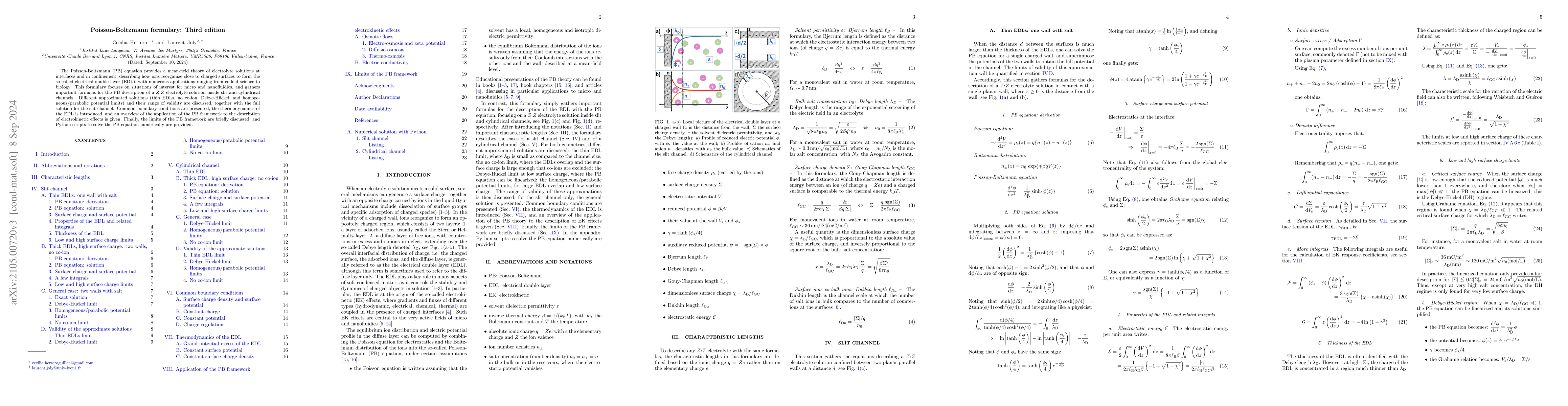 This paper presents a comprehensive formulary for the Poisson-Boltzmann equation, detailing various approximated solutions and boundary conditions for Z:Z electrolyte solutions in confined geometries. It includes Python scripts for numerical solutions and discusses the limitations of the PB framework.