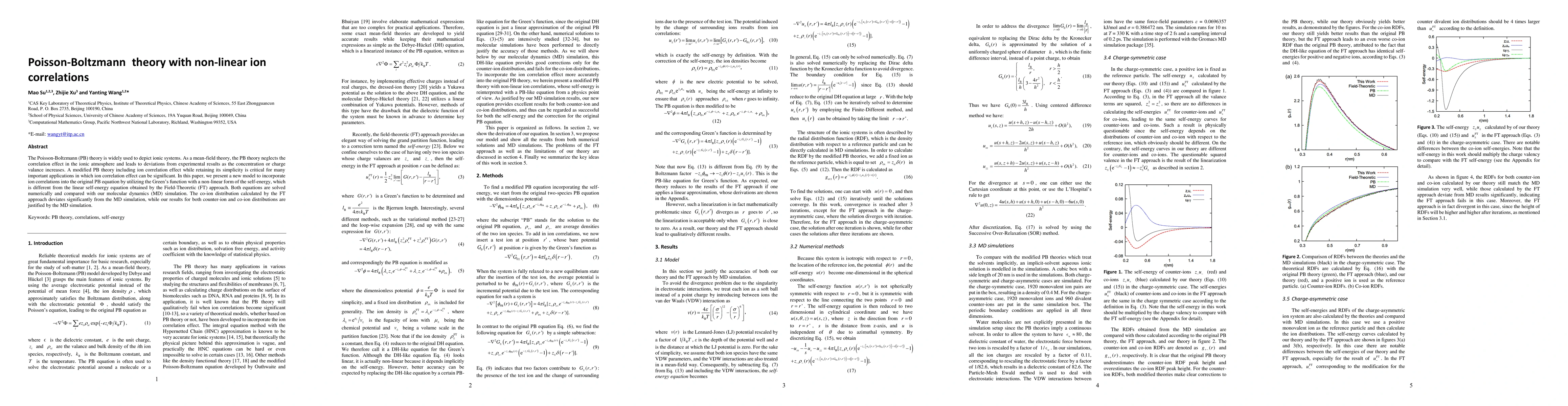 The Poisson-Boltzmann (PB) theory is widely used to depict ionic systems. As a mean-field theory, the PB theory neglects the correlation effect in the ionic atmosphere and leads to deviations from experimental results as the concentration or charge valance increases. A modified PB theory including ion correlation effect while retaining its simplicity is critical for many important applications in which ion correlation effect can be significant. In this paper, we present a new model to incorporate ion correlations into the original PB equation by utilizing the Green's function with a non-linear form of the self-energy, which is different from the linear self-energy equation obtained by the Field-Theoretic (FT) approach. Both equations are solved numerically and compared with our molecular dynamics (MD) simulation. The co-ion distribution calculated by the FT approach deviates significantly from the MD simulation, while our results for both counter-ion and co-ion distributions are justified by the MD simulation.