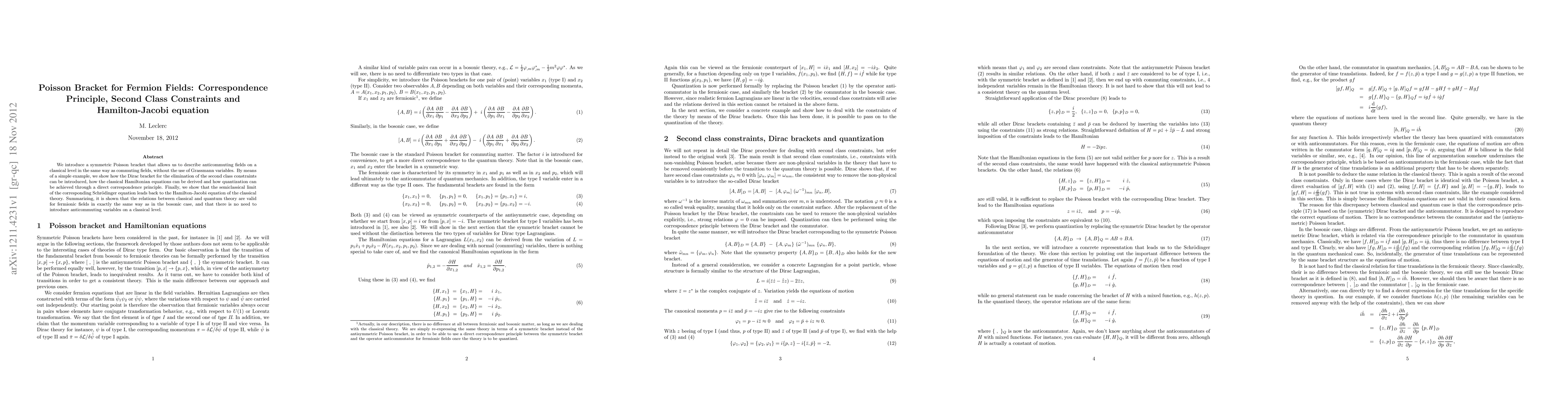 This paper presents a symmetric Poisson bracket for fermion fields, eliminating the need for Grassmann variables in classical descriptions. It demonstrates the derivation of Hamiltonian equations, quantization via a correspondence principle, and the semiclassical limit leading to the Hamilton-Jacobi equation. The findings show equivalence in classical-quantum relations for fermionic fields as in bosonic fields, without requiring anticommuting variables classically.