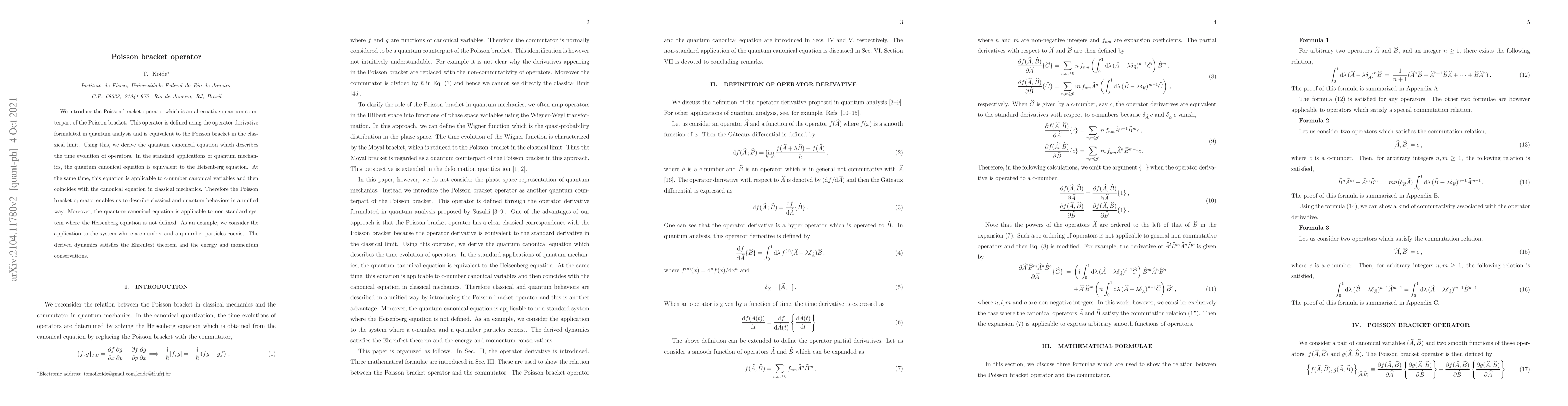 The paper introduces a Poisson bracket operator as a quantum counterpart, unifying classical and quantum mechanics, and derives a quantum canonical equation applicable to both classical and quantum systems, including non-standard systems where the Heisenberg equation is inapplicable.