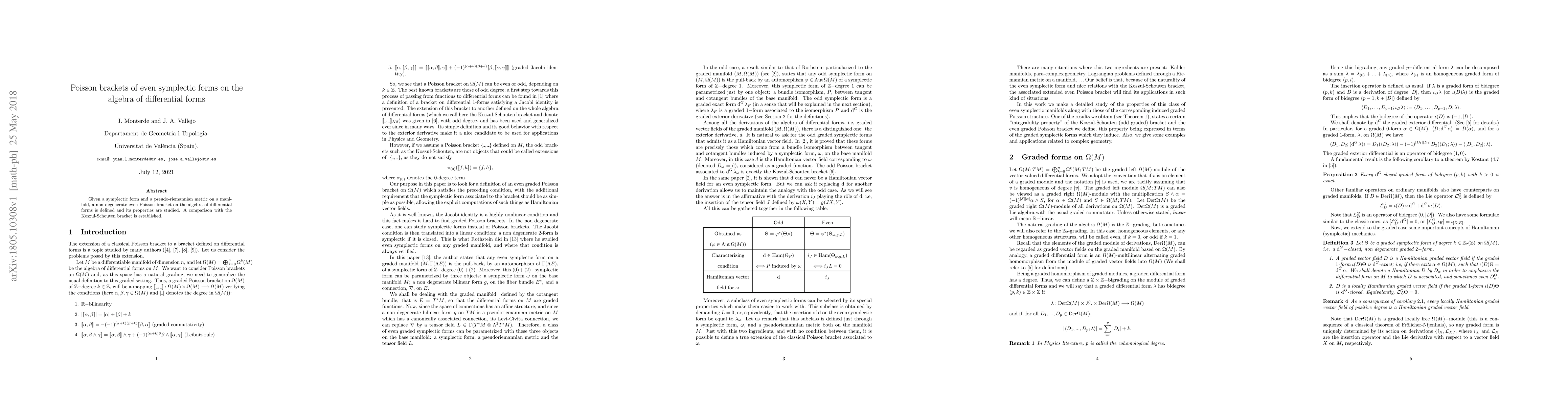 Summary: This research defines a nondegenerate even Poisson bracket on the algebra of differential forms using a symplectic form and pseudo-Riemannian metric, and explores its properties, comparing it with the Koszul-Schouten bracket.