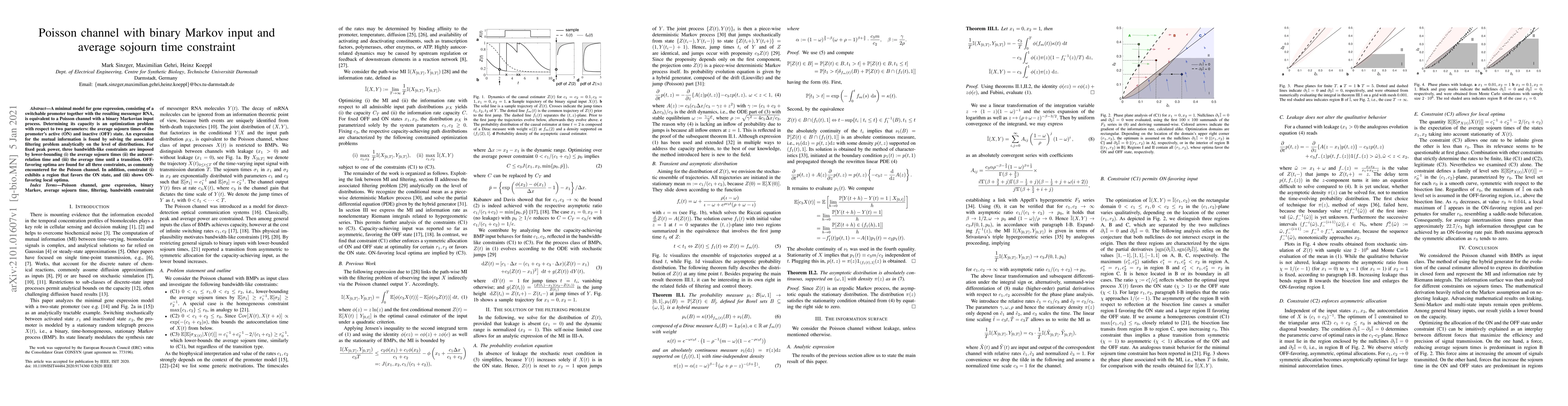 A minimal model for gene expression, consisting of a switchable promoter together with the resulting messenger RNA, is equivalent to a Poisson channel with a binary Markovian input process. Determining its capacity is an optimization problem with respect to two parameters: the average sojourn times of the promoter's active (ON) and inactive (OFF) state. An expression for the mutual information is found by solving the associated filtering problem analytically on the level of distributions. For fixed peak power, three bandwidth-like constraints are imposed by lower-bounding (i) the average sojourn times (ii) the autocorrelation time and (iii) the average time until a transition. OFF-favoring optima are found for all three constraints, as commonly encountered for the Poisson channel. In addition, constraint (i) exhibits a region that favors the ON state, and (iii) shows ON-favoring local optima.