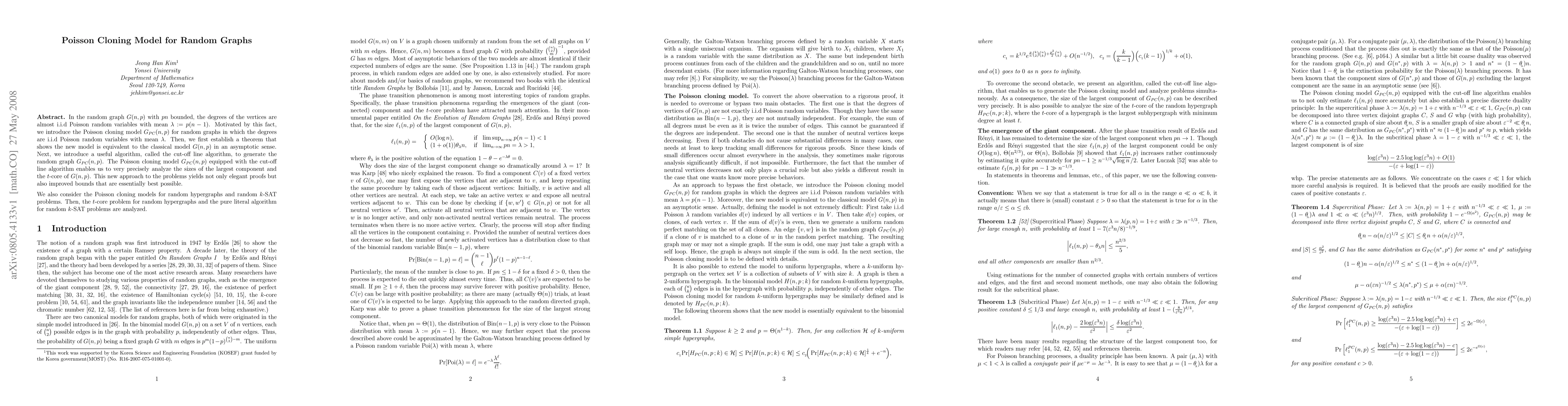 In the random graph $G(n,p)$ with $pn$ bounded, the degrees of the vertices are almost i.i.d Poisson random variables with mean $\gl:= p(n-1)$. Motivated by this fact, we introduce the Poisson cloning model $G_{PC} (n,p)$ for random graphs in which the degrees are i.i.d Poisson random variables with mean $\gl$. Then, we first establish a theorem that shows the new model is equivalent to the classical model $G(n,p)$ in an asymptotic sense. Next, we introduce a useful algorithm, called the cut-off line algorithm, to generate the random graph $G_{PC} (n,p)$. The Poisson cloning model $G_{PC}(n,p)$ equipped with the cut-off line algorithm enables us to very precisely analyze the sizes of the largest component and the $t$-core of $G(n,p)$. This new approach to the problems yields not only elegant proofs but also improved bounds that are essentially best possible. We also consider the Poisson cloning models for random hypergraphs and random $k$-SAT problems. Then, the $t$-core problem for random hypergraphs and the pure literal algorithm for random $k$-SAT problems are analyzed.