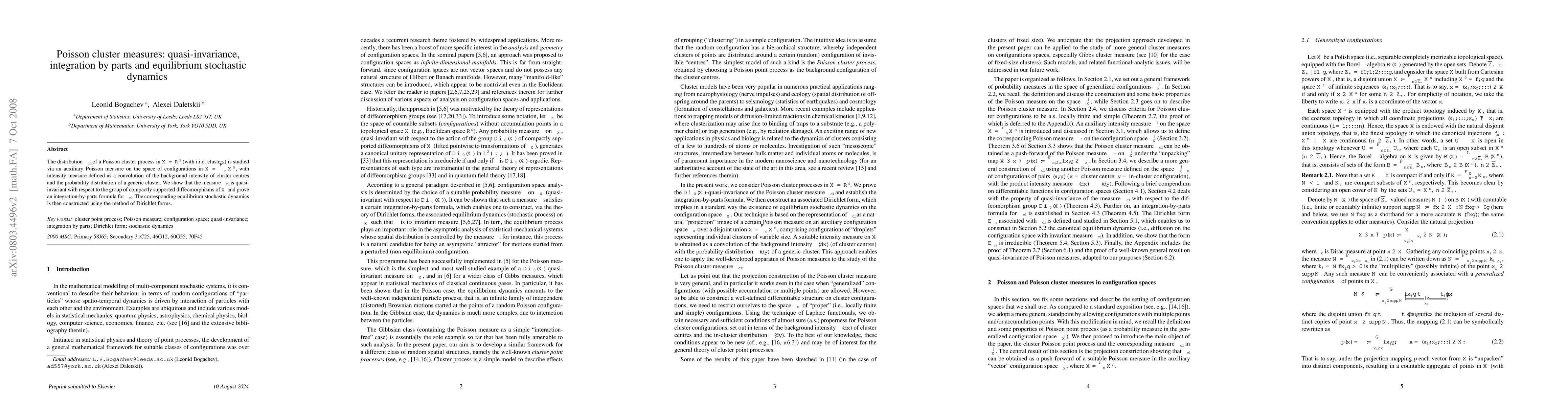 The distribution $\mu_{cl}$ of a Poisson cluster process in $X=\mathbb{R}^{d}$ (with i.i.d. clusters) is studied via an auxiliary Poisson measure on the space of configurations in $\mathfrak{X}=\sqcup_{n} X^n$, with intensity measure defined as a convolution of the background intensity of cluster centres and the probability distribution of a generic cluster. We show that the measure $\mu_{cl}$ is quasi-invariant with respect to the group of compactly supported diffeomorphisms of $X$ and prove an integration-by-parts formula for $\mu_{cl}$. The corresponding equilibrium stochastic dynamics is then constructed using the method of Dirichlet forms.
