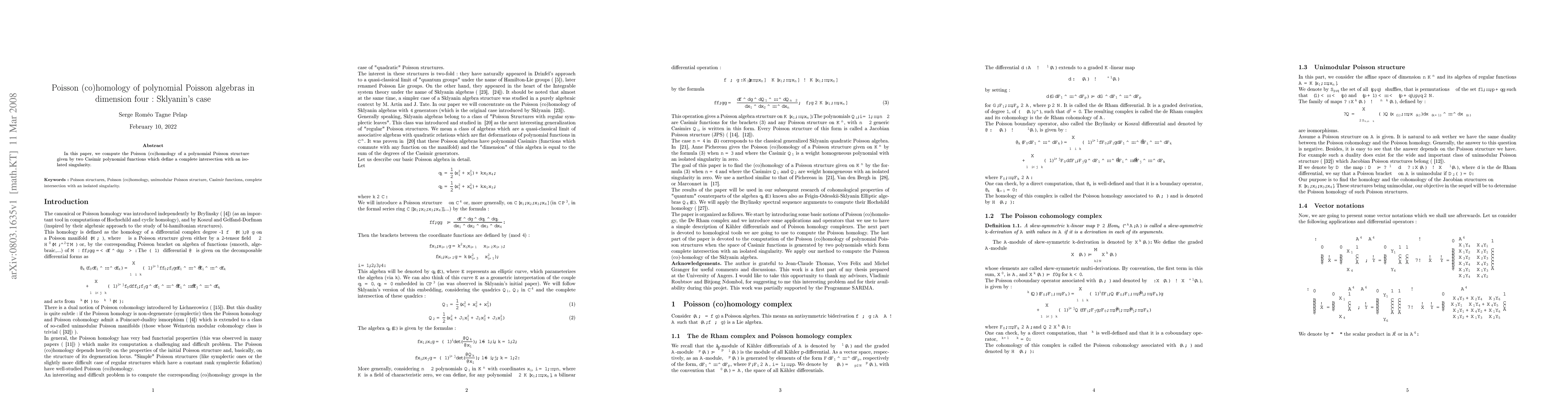 This paper calculates the Poisson (co)homology for a specific polynomial Poisson structure in dimension four, focusing on the case defined by two Casimir polynomials leading to a complete intersection with an isolated singularity, as proposed by Sklyanin.