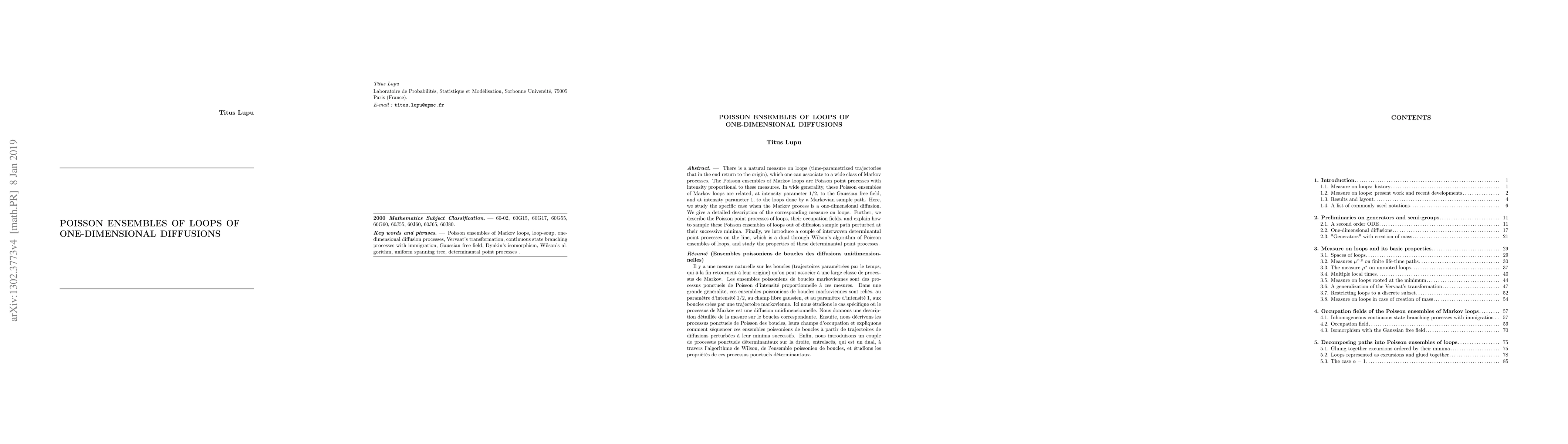 This paper explores Poisson ensembles of Markov loops in the context of one-dimensional diffusions, detailing the intensity measure and extending Vervaat's bridge-to-excursion transformation. It also describes sampling methods for these ensembles and introduces determinantal point processes linked to these loop ensembles.