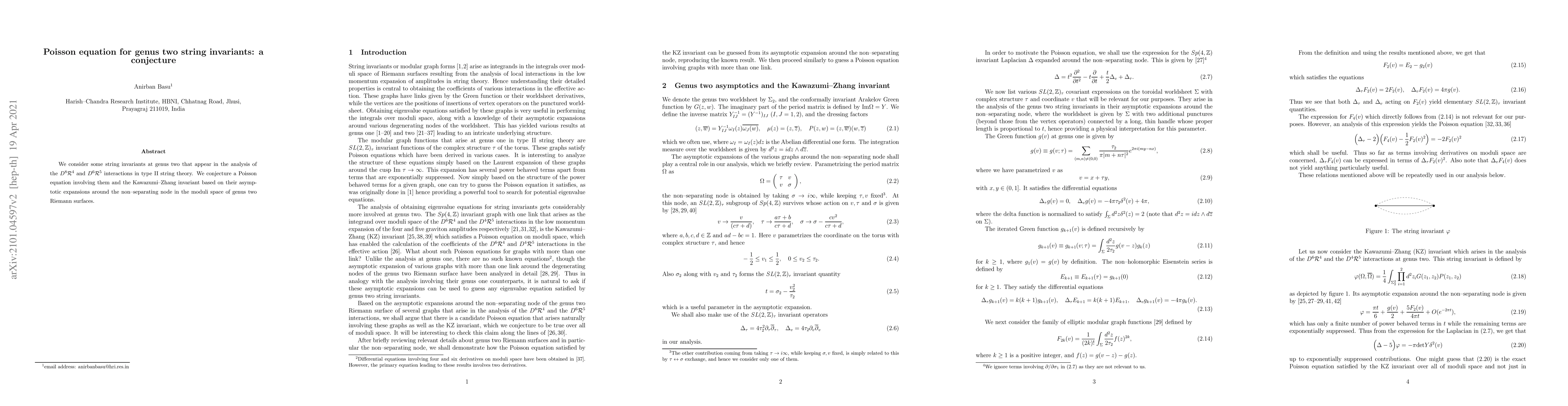 We consider some string invariants at genus two that appear in the analysis of the $D^8\mathcal{R}^4$ and $D^6\mathcal{R}^5$ interactions in type II string theory. We conjecture a Poisson equation involving them and the Kawazumi--Zhang invariant based on their asymptotic expansions around the non--separating node in the moduli space of genus two Riemann surfaces.