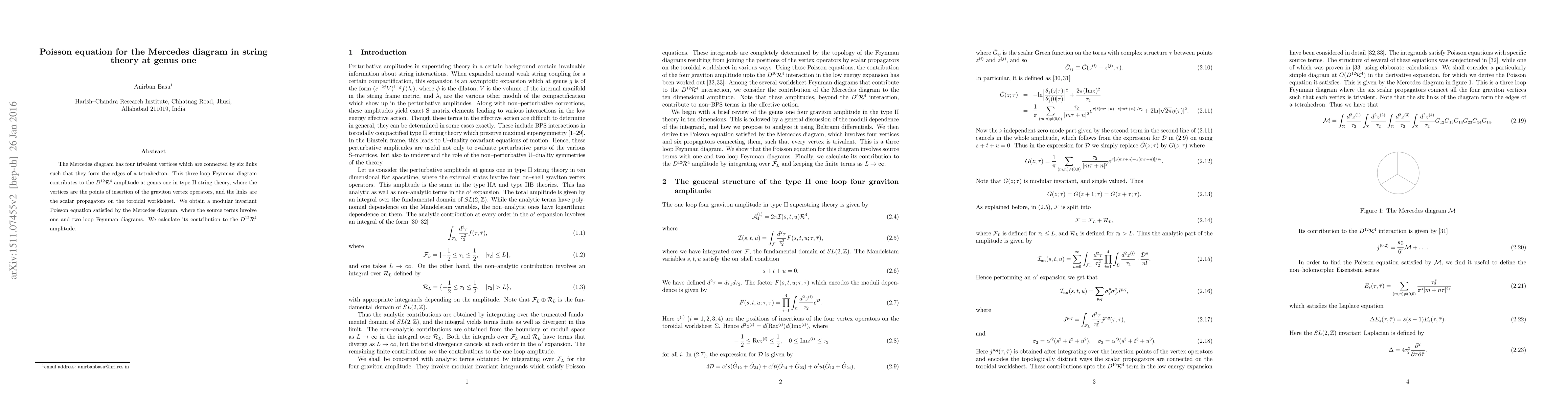 The Mercedes diagram has four trivalent vertices which are connected by six links such that they form the edges of a tetrahedron. This three loop Feynman diagram contributes to the D^{12} R^4 amplitude at genus one in type II string theory, where the vertices are the points of insertion of the graviton vertex operators, and the links are the scalar propagators on the toroidal worldsheet. We obtain a modular invariant Poisson equation satisfied by the Mercedes diagram, where the source terms involve one and two loop Feynman diagrams. We calculate its contribution to the D^{12} R^4 amplitude.