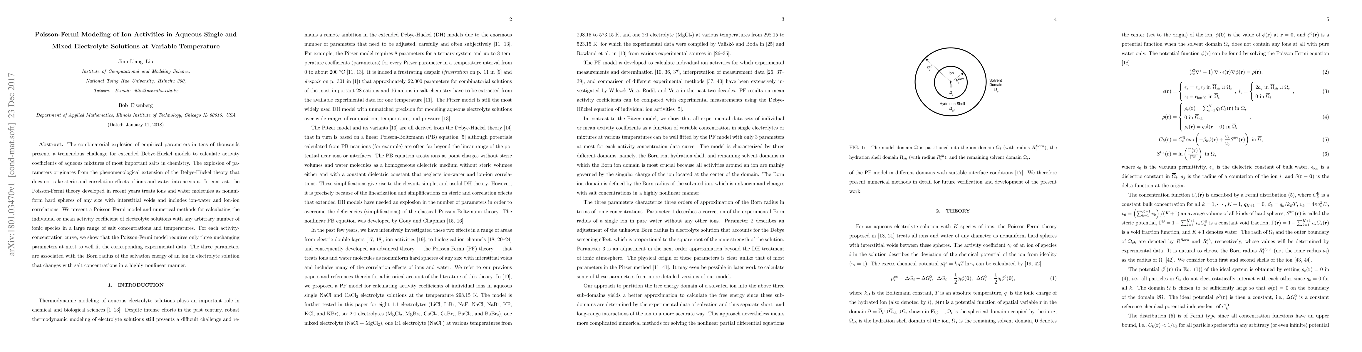 The paper proposes a Poisson-Fermi model to address the limitations of extended Debye-Hückel models in calculating activity coefficients for aqueous electrolyte solutions, requiring only three parameters to fit experimental data effectively. This model considers ion-water and ion-ion correlations, offering a more accurate representation of ion activities in single and mixed electrolyte solutions across various temperatures.