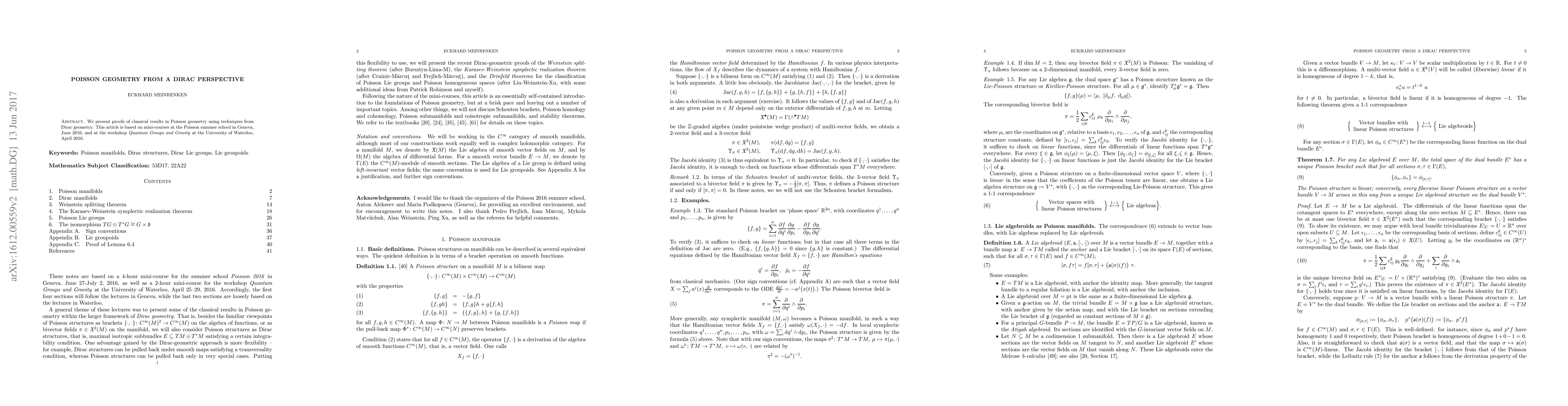 This paper demonstrates classical Poisson geometry results through the lens of Dirac geometry techniques, drawing from mini-courses held in Geneva and Waterloo in 2016. The work bridges Poisson and Dirac approaches to deepen understanding of geometric structures.