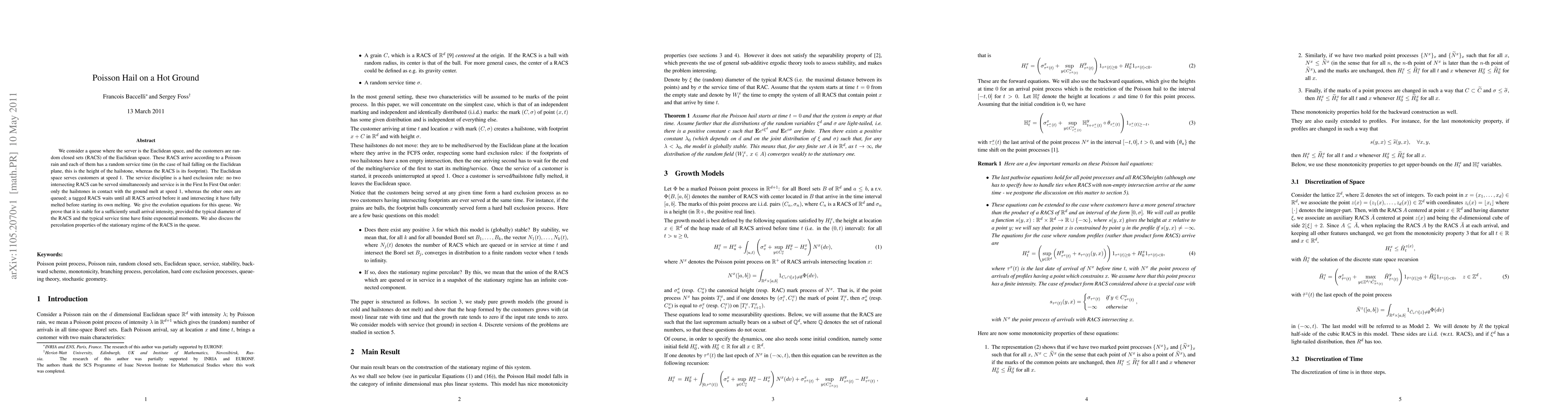 Researchers study a queue system where hailstones arrive according to Poisson rain and have random service times. They prove the queue is stable for small arrival rates under certain conditions.
