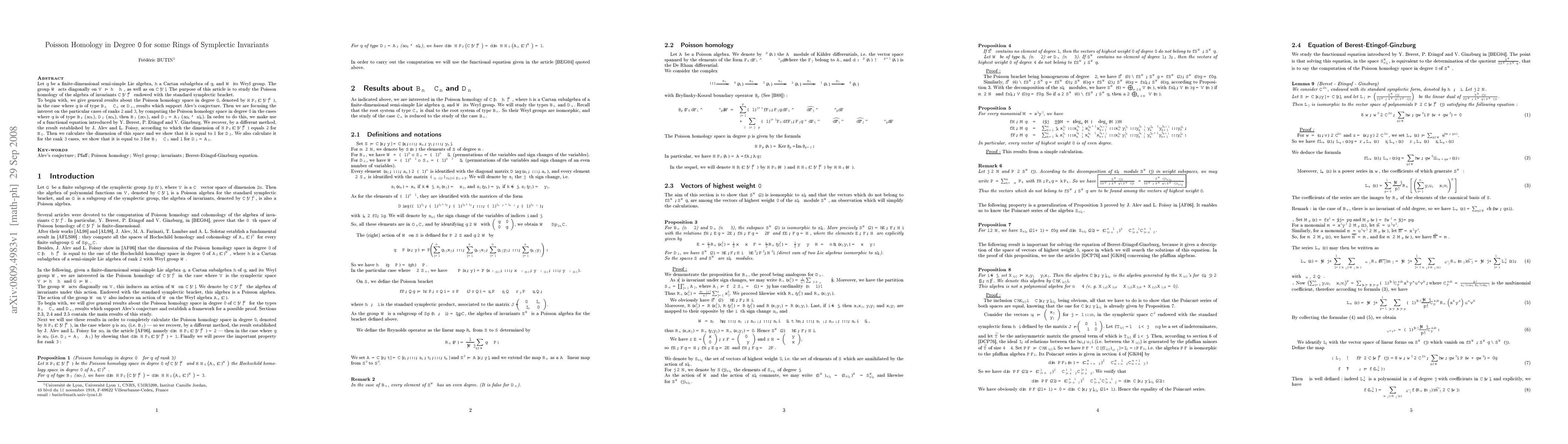 This paper investigates the Poisson homology in degree 0 for the algebra of symplectic invariants $\mathbb{C}[V]^W$ associated with certain semi-simple Lie algebras. It provides results supporting Alev's conjecture and computes the dimension of $HP_0(\mathbb{C}[V]^W)$ for specific types, confirming earlier findings for $B_2$ and $D_2$, and revealing new dimensions for $B_3$ and $D_3$.