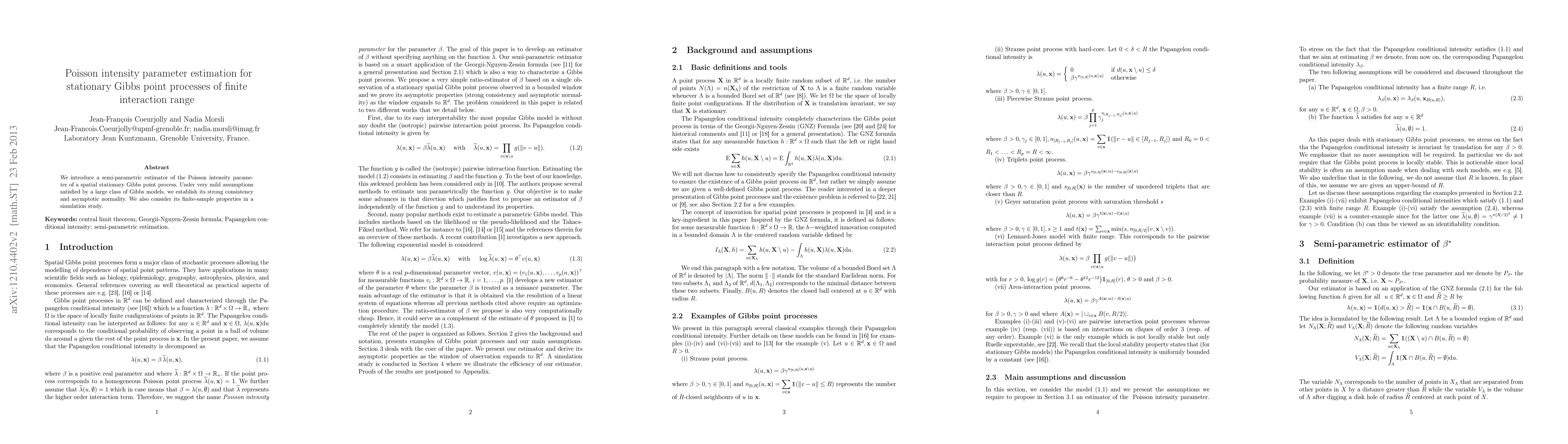 This paper proposes a semi-parametric estimator for the Poisson intensity parameter in stationary Gibbs point processes with finite interaction range, demonstrating its strong consistency, asymptotic normality, and finite-sample properties through simulation.