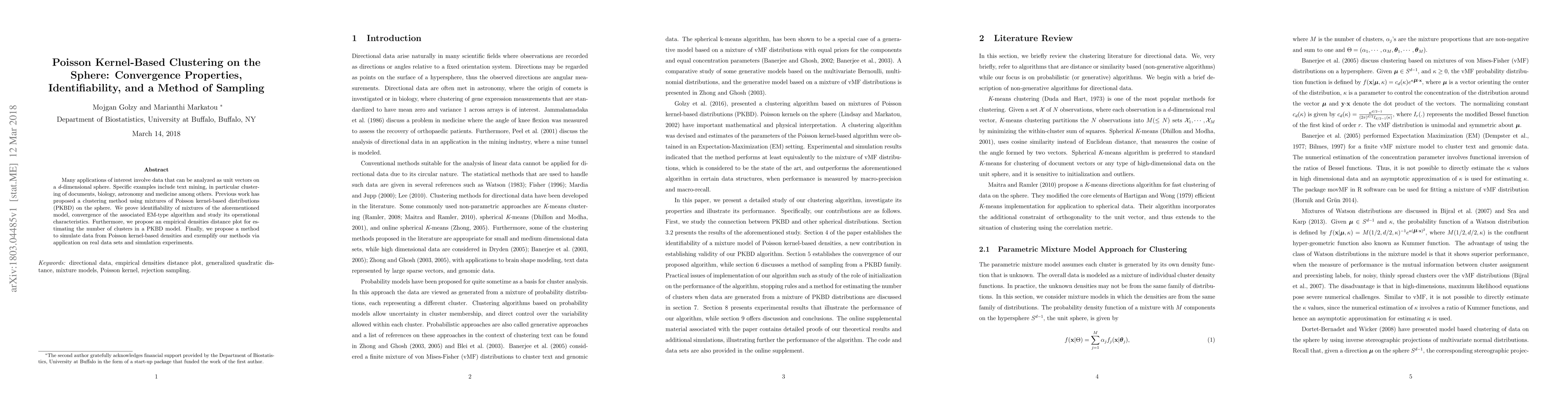 Many applications of interest involve data that can be analyzed as unit vectors on a d-dimensional sphere. Specific examples include text mining, in particular clustering of documents, biology, astronomy and medicine among others. Previous work has proposed a clustering method using mixtures of Poisson kernel-based distributions (PKBD) on the sphere. We prove identifiability of mixtures of the aforementioned model, convergence of the associated EM-type algorithm and study its operational characteristics. Furthermore, we propose an empirical densities distance plot for estimating the number of clusters in a PKBD model. Finally, we propose a method to simulate data from Poisson kernel-based densities and exemplify our methods via application on real data sets and simulation experiments.