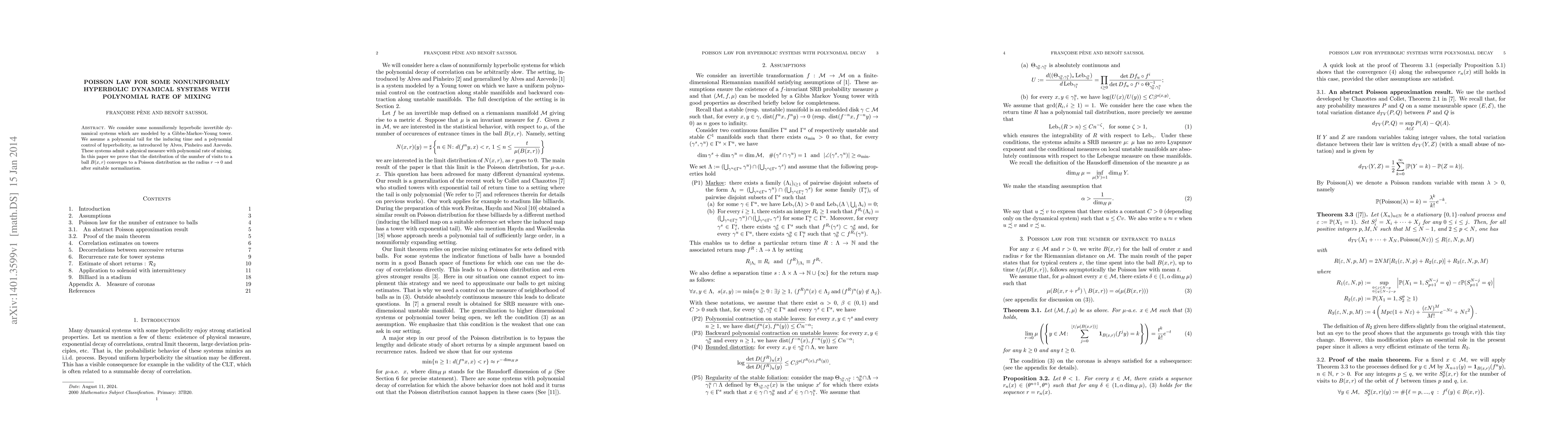 The paper proves the Poisson law for the distribution of visits to small balls in specific nonuniformly hyperbolic systems, establishing a connection between statistical properties and the structure of Gibbs-Markov-Young towers.
