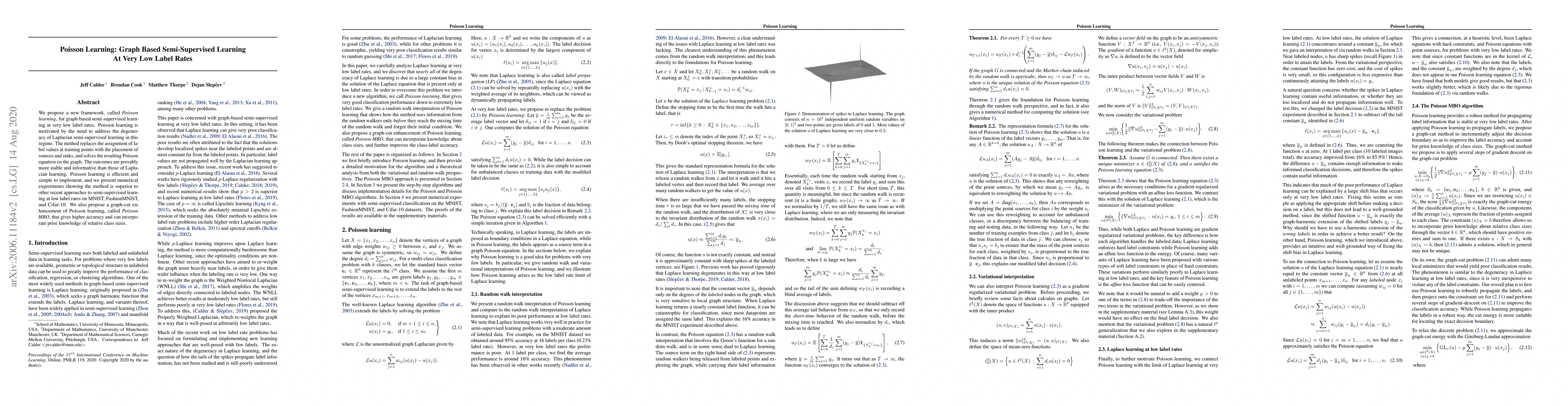 Poisson Learning introduces a novel graph-based semi-supervised learning approach for scenarios with very few labeled data, addressing the limitations of Laplacian learning. It outperforms existing methods on datasets like MNIST, FashionMNIST, and Cifar-10, and includes an enhanced version, Poisson MBO, that leverages class size prior knowledge for improved accuracy.