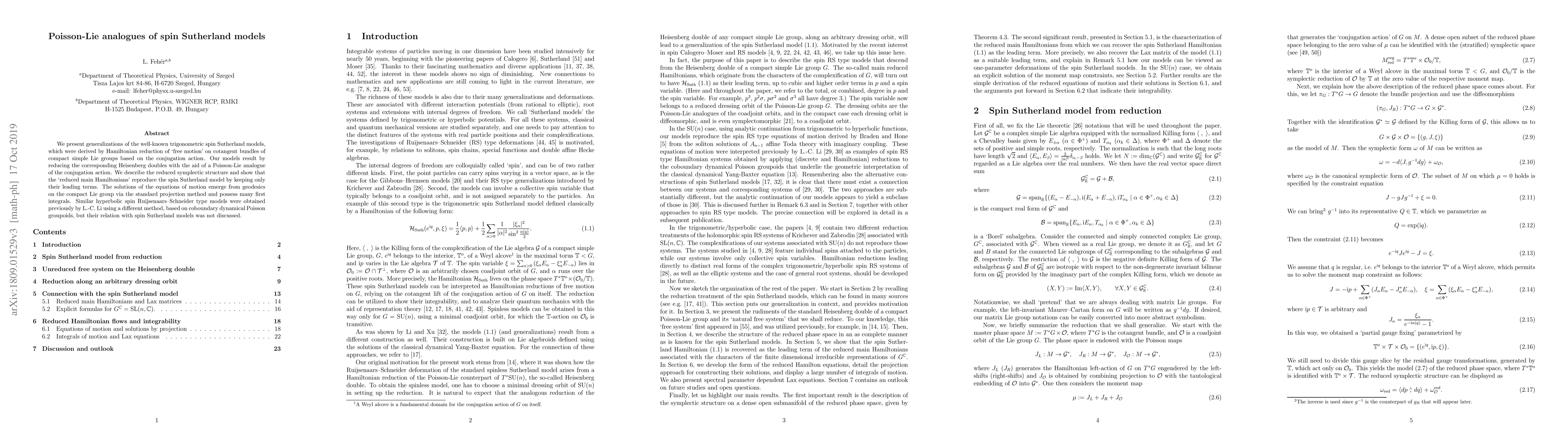 This paper generalizes trigonometric spin Sutherland models using Poisson-Lie analogues of the conjugation action, resulting in hyperbolic spin Ruijsenaars-Schneider models. The reduced symplectic structure and leading terms of the Hamiltonians reproduce the spin Sutherland models, with solutions derived from geodesics on compact Lie groups.