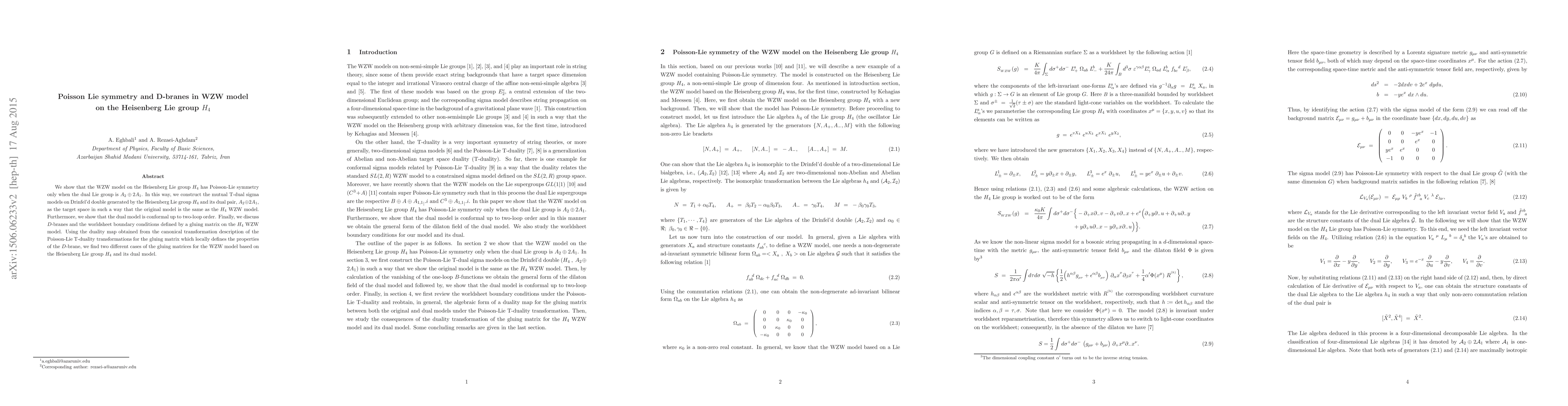 This paper demonstrates that the WZW model on the Heisenberg Lie group $H_4$ exhibits Poisson-Lie symmetry when the dual group is ${ A}_2 \oplus 2{ A}_1$, constructing mutual T-dual sigma models and showing the dual model's conformality up to two-loop order. It also explores $D$-branes and their boundary conditions, identifying two distinct gluing matrix cases for the $H_4$ WZW model.