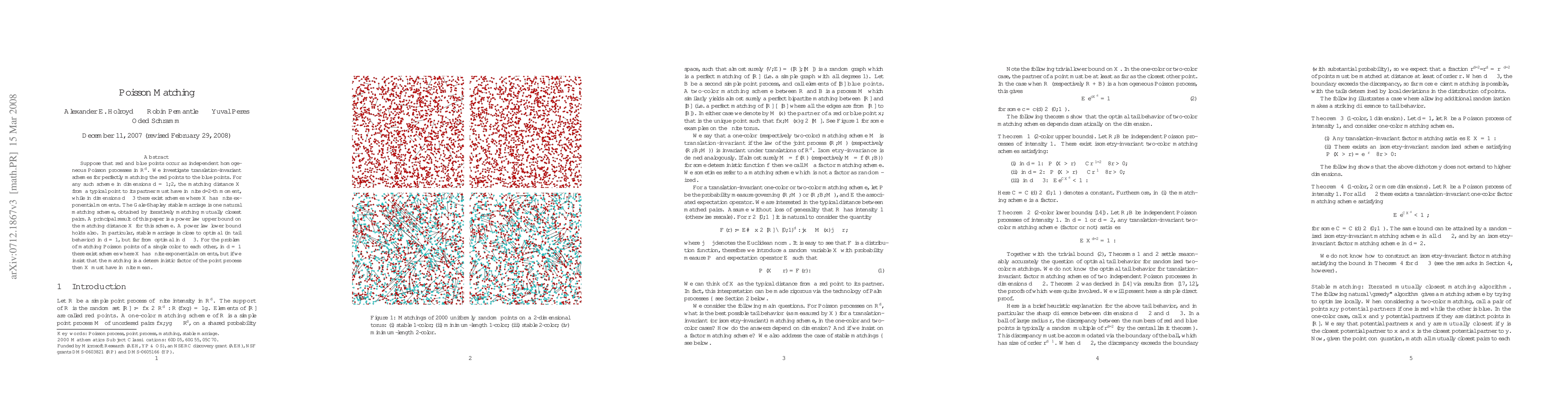 Suppose that red and blue points occur as independent homogeneous Poisson processes in R^d. We investigate translation-invariant schemes for perfectly matching the red points to the blue points. For any such scheme in dimensions d=1,2, the matching distance X from a typical point to its partner must have infinite d/2-th moment, while in dimensions d>=3 there exist schemes where X has finite exponential moments. The Gale-Shapley stable marriage is one natural matching scheme, obtained by iteratively matching mutually closest pairs. A principal result of this paper is a power law upper bound on the matching distance X for this scheme. A power law lower bound holds also. In particular, stable marriage is close to optimal (in tail behavior) in d=1, but far from optimal in d>=3. For the problem of matching Poisson points of a single color to each other, in d=1 there exist schemes where X has finite exponential moments, but if we insist that the matching is a deterministic factor of the point process then X must have infinite mean.