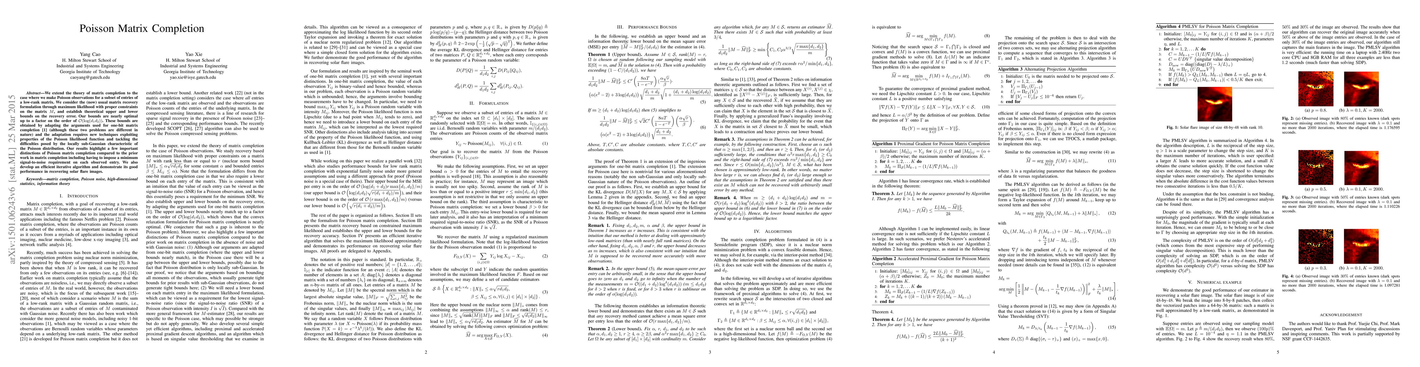 This paper extends matrix completion theory to handle Poisson observations for a subset of entries in a low-rank matrix, establishing nearly optimal bounds on recovery error. It introduces new techniques to address the unique challenges posed by the Poisson distribution and develops an efficient iterative algorithm that performs well in recovering solar flare images.