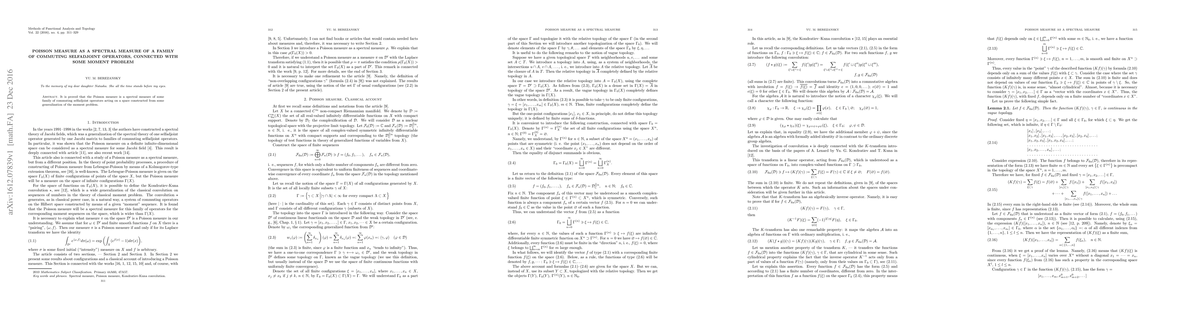 It is proved that the Poisson measure is a spectral measure of some family of commuting selfadjoint operators acting on a space constructed from some generalization of the moment problem.