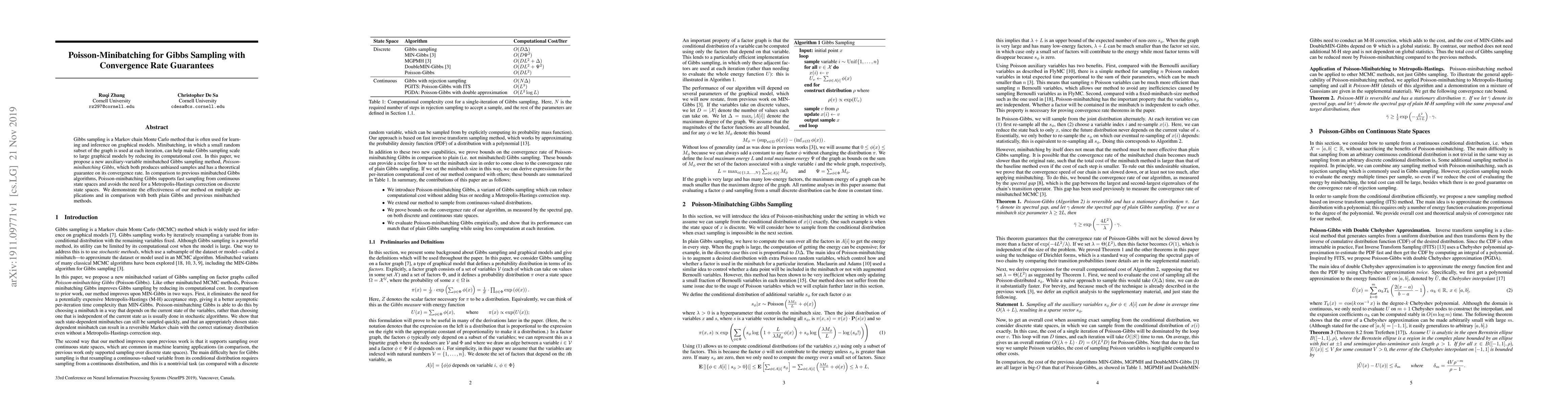 This paper introduces Poisson-minibatching Gibbs sampling, a novel method that combines minibatching with Gibbs sampling to efficiently scale to large graphical models. It guarantees convergence rate and supports fast sampling without requiring Metropolis-Hastings corrections, outperforming previous minibatching methods in various applications.